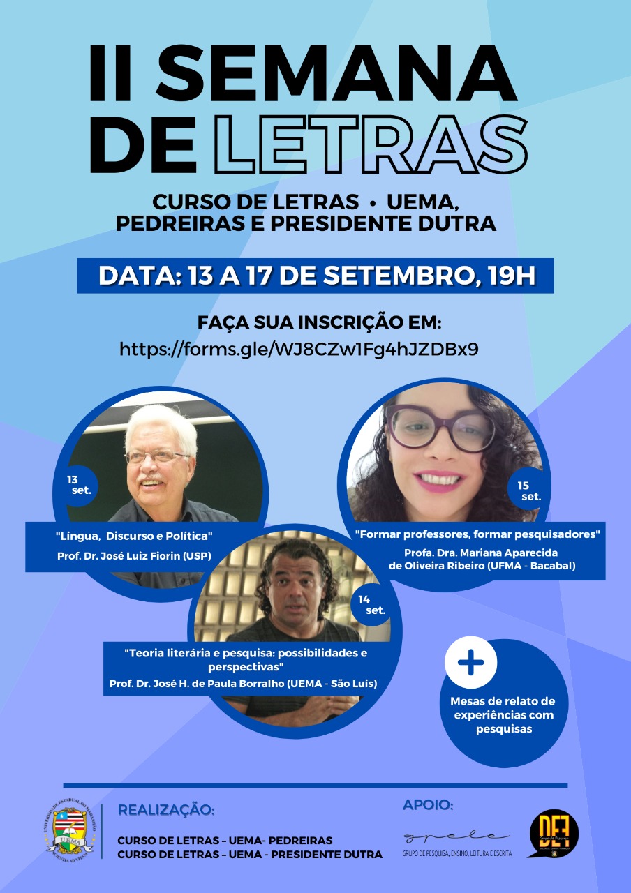 Os Cursos de Letras dos campi Pedreiras e Presidente Dutra da Universidade Estadual do Maranhão (UEMA) promovem, de 13 a 17 de setembro, a II Semana de Letras.