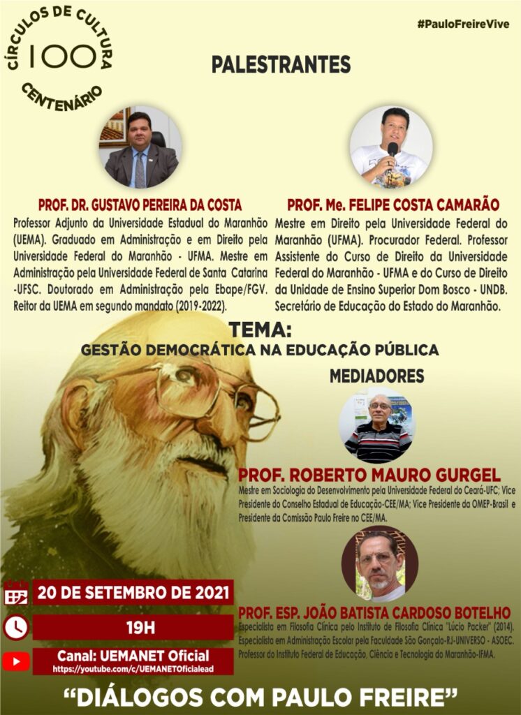 O Projeto “Círculos de Cultura: Diálogos com Paulo Freire” promove hoje(20), às 19h, a palestra “Gestão Democrática na educação pública”, que terá participação do reitor da Universidade Estadual do Maranhão (UEMA), Gustavo Costa; e do secretário de Educação do Estado do Maranhão (SEDUC), Felipe Camarão.