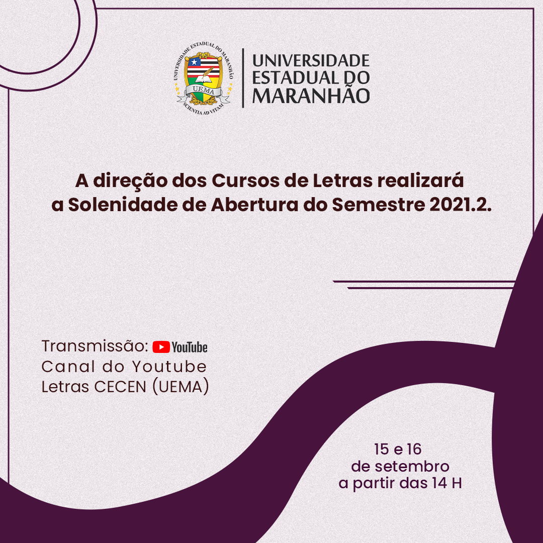 A direção dos Cursos de Letras, da Universidade Estadual do Maranhão (UEMA) – Campus Paulo VI, realizará amanhã e quinta-feira (15 e 16), a Solenidade de Abertura do Semestre 2021.2.