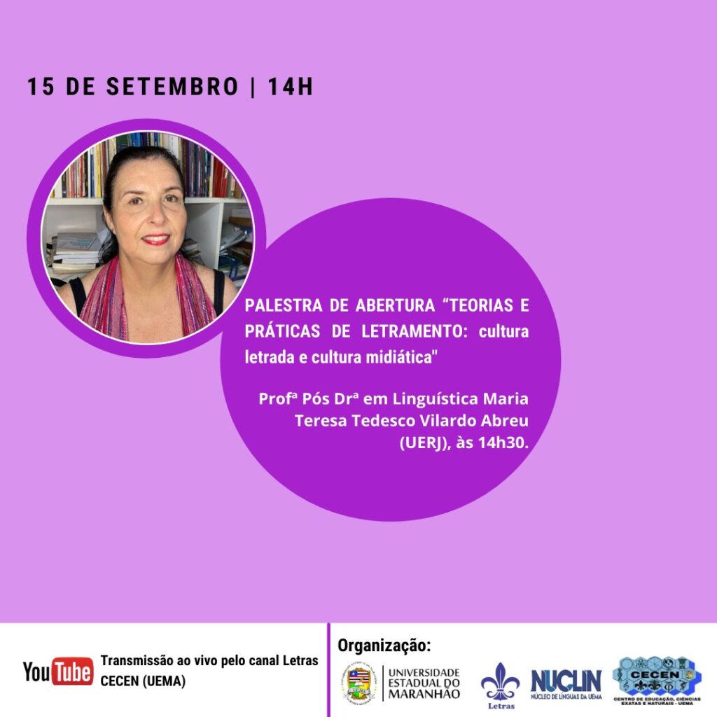 O evento acontecerá a partir das 14h com a realização da palestra de abertura intitulada “Teoria e práticas de letramento: cultura letrada e cultura e midiática” que será proferida pela professora, Doutora em Linguística, Maria Teresa Tedesco Vilardo Abreu da UERJ.