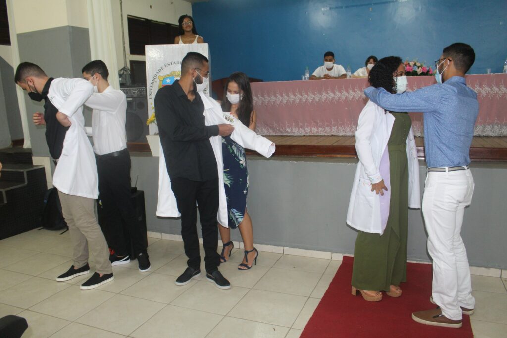 Nessa quarta-feira (15), 35 novos alunos da turma XIX do Curso de Medicina foram recepcionados na Cerimônia do Jaleco, realizada no Auditório Leôncio Magno, no Campus Caxias da Universidade Estadual do Maranhão (UEMA). O evento foi dividido em dois momentos. O primeiro, às 16h e o outro, às 19h. A medida foi adotada para que não houvesse aglomeração, como determinam as medidas sanitárias.
