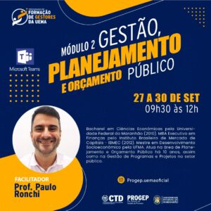 Em continuidade ao Programa de Formação de Gestores da Uema, a Pró-Reitoria de Gestão de Pessoas (PROGEP), por meio da Coordenadoria de Treinamento e Desenvolvimento, da Universidade Estadual do Maranhão (UEMA), oferecerá o segundo módulo “Gestão, Planejamento e Orçamento Público”, cujo objetivo é compreender os instrumentos de planejamento, execução e gestão orçamentária no setor público. No módulo serão apresentados e discutidos os seguintes temas:  Instrumentos de Planejamento; Lei de Diretrizes Orçamentárias (LDO); Lei Orçamentária Anual.