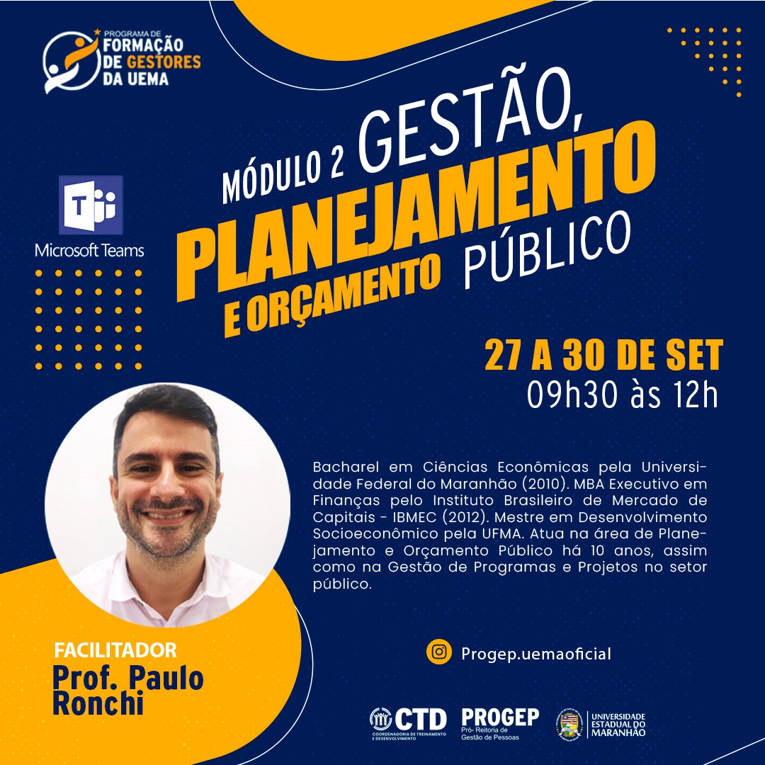 Em continuidade ao Programa de Formação de Gestores da Uema, a Pró-Reitoria de Gestão de Pessoas (PROGEP), por meio da Coordenadoria de Treinamento e Desenvolvimento, da Universidade Estadual do Maranhão (UEMA), oferecerá o segundo módulo “Gestão, Planejamento e Orçamento Público”, cujo objetivo é compreender os instrumentos de planejamento, execução e gestão orçamentária no setor público. No módulo serão apresentados e discutidos os seguintes temas:  Instrumentos de Planejamento; Lei de Diretrizes Orçamentárias (LDO); Lei Orçamentária Anual.