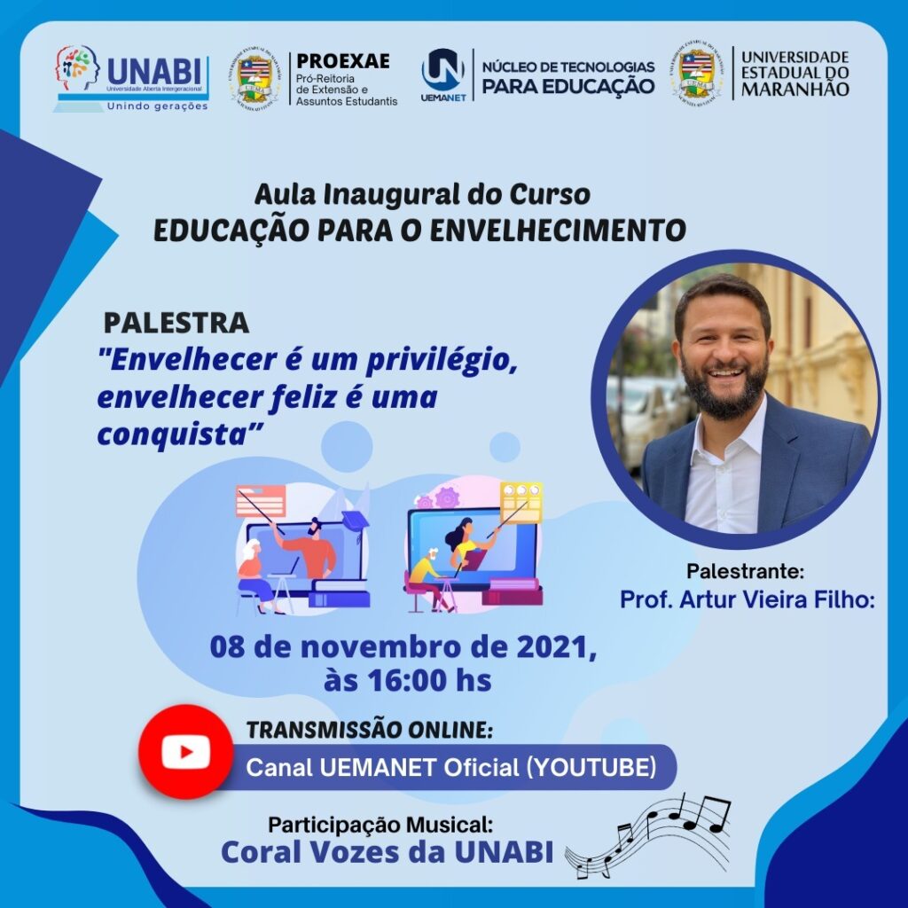 No próximo dia 8 de novembro, às 16h, a Universidade Estadual do Maranhão, por meio da pró –Reitoria de Extensão e Assuntos Estudantis- PROEXAE realizará a aula inaugural do curso de formação continuada “Educação para o Envelhecimento”. O evento será on-line por meio do canal do Youtube do UemaNet.