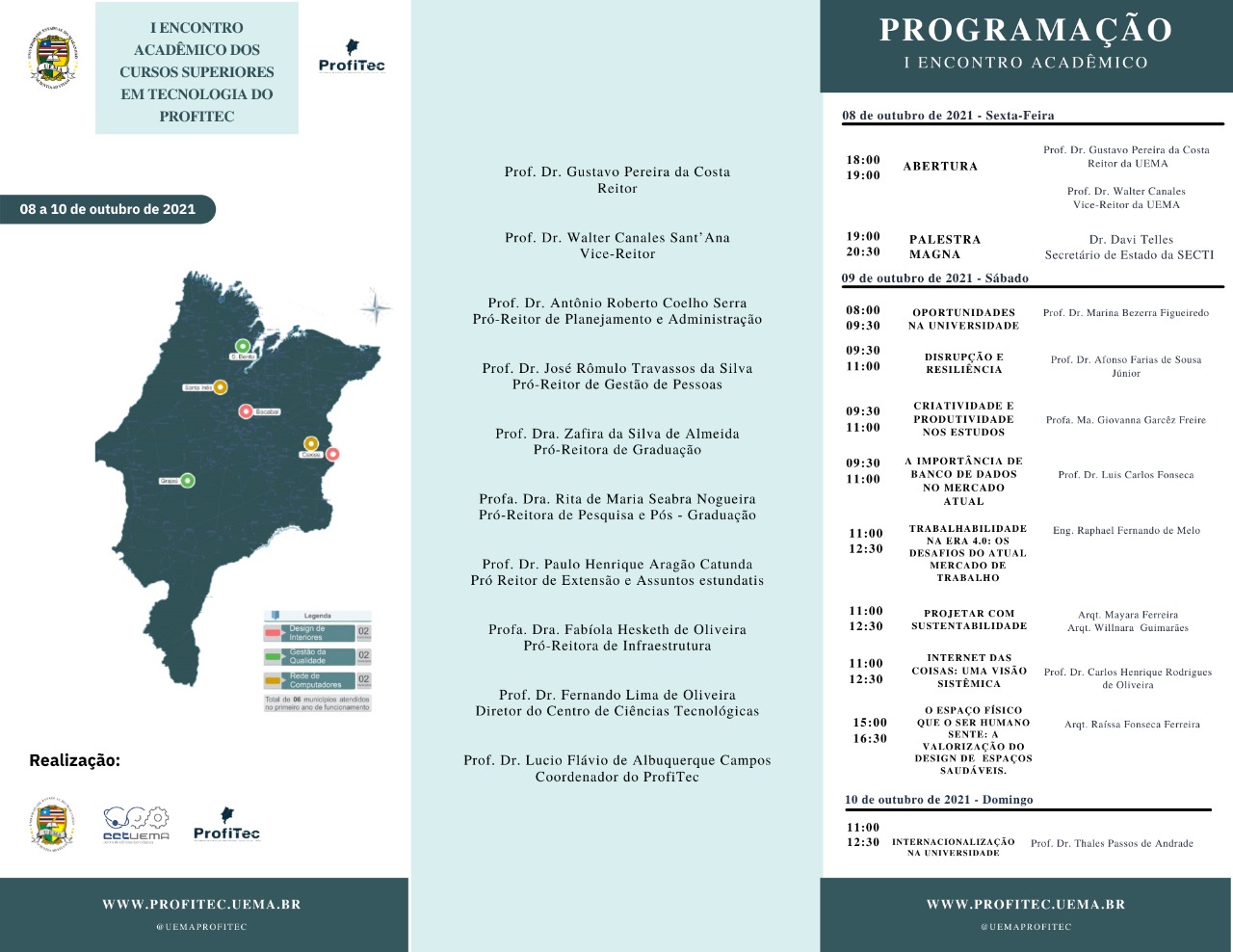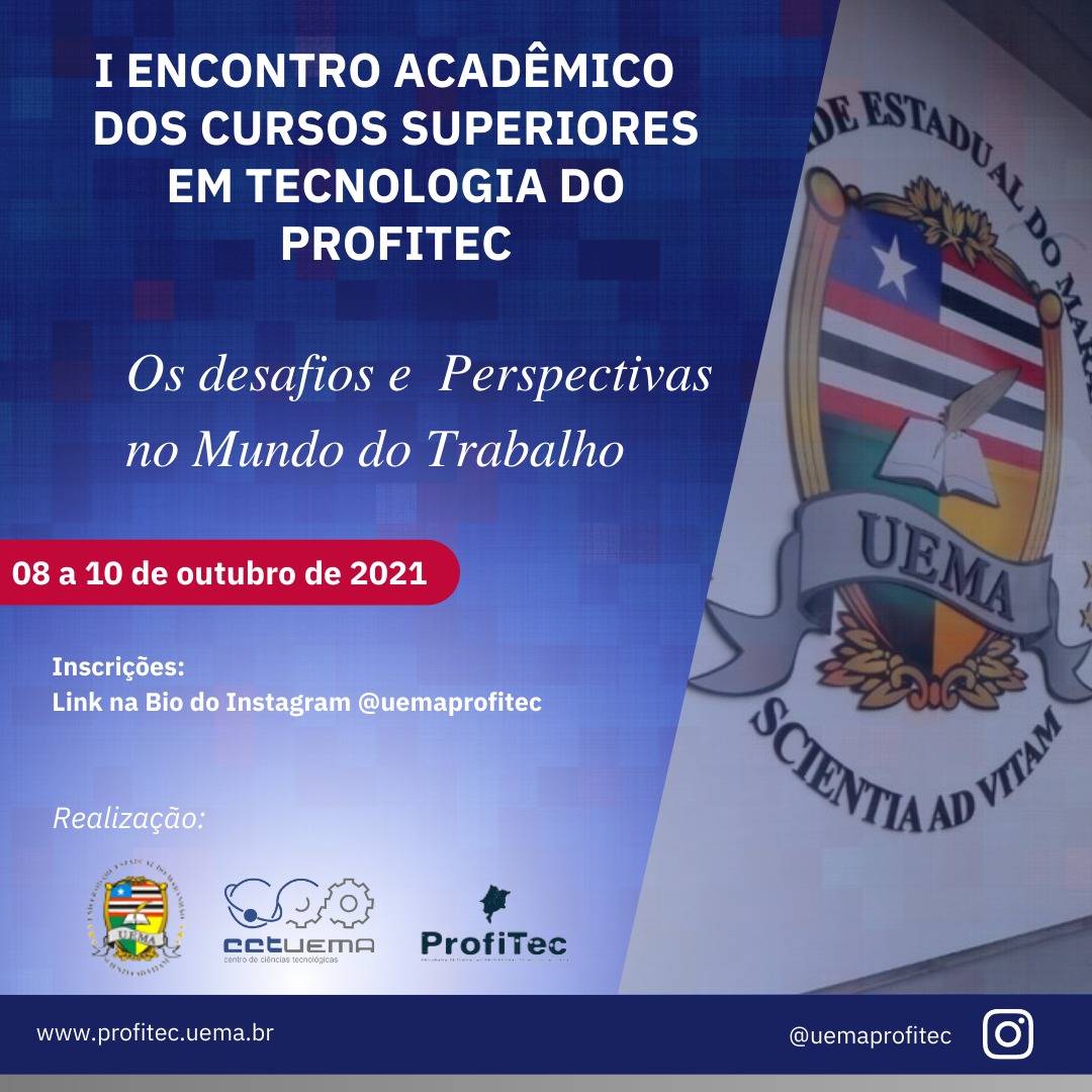 Estão abertas as inscrições para o I Encontro Acadêmico dos Cursos Superiores em Tecnologia do Programa de Formação Profissional e Tecnológica da Universidade Estadual do Maranhão (PROFITEC/UEMA), que acontecerá no período de 8 a 10 de outubro.