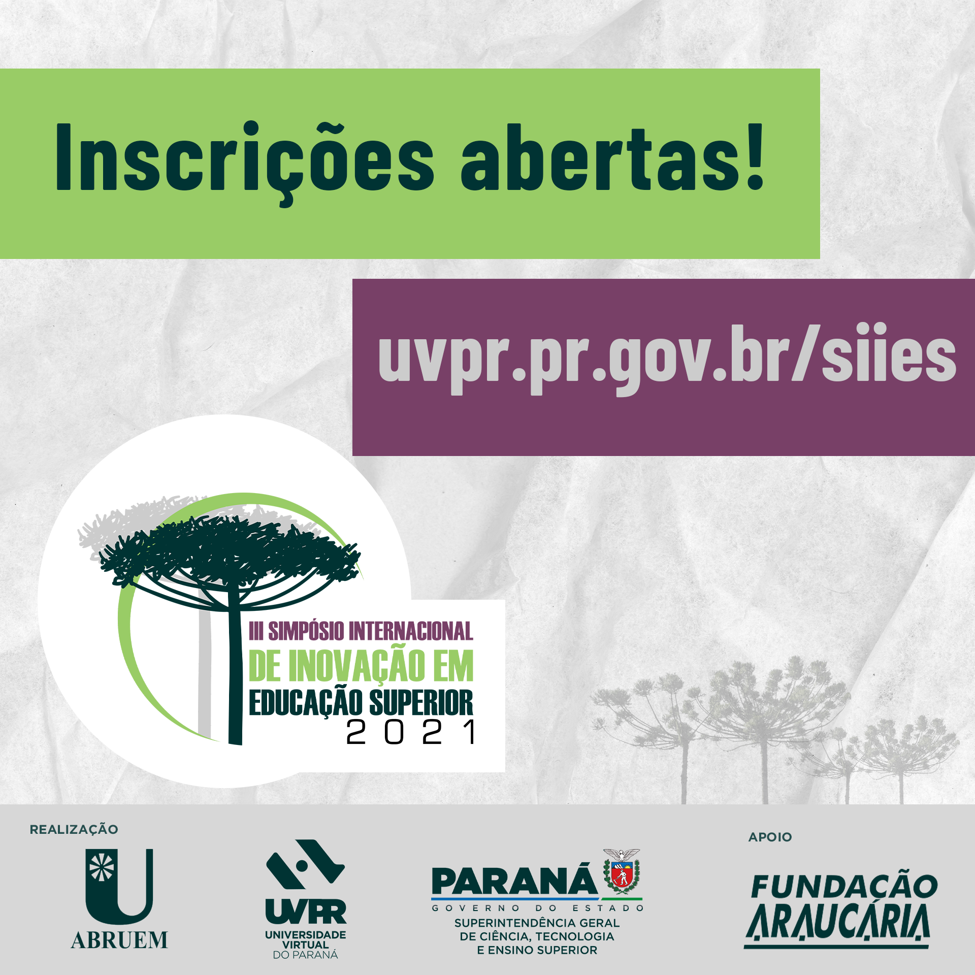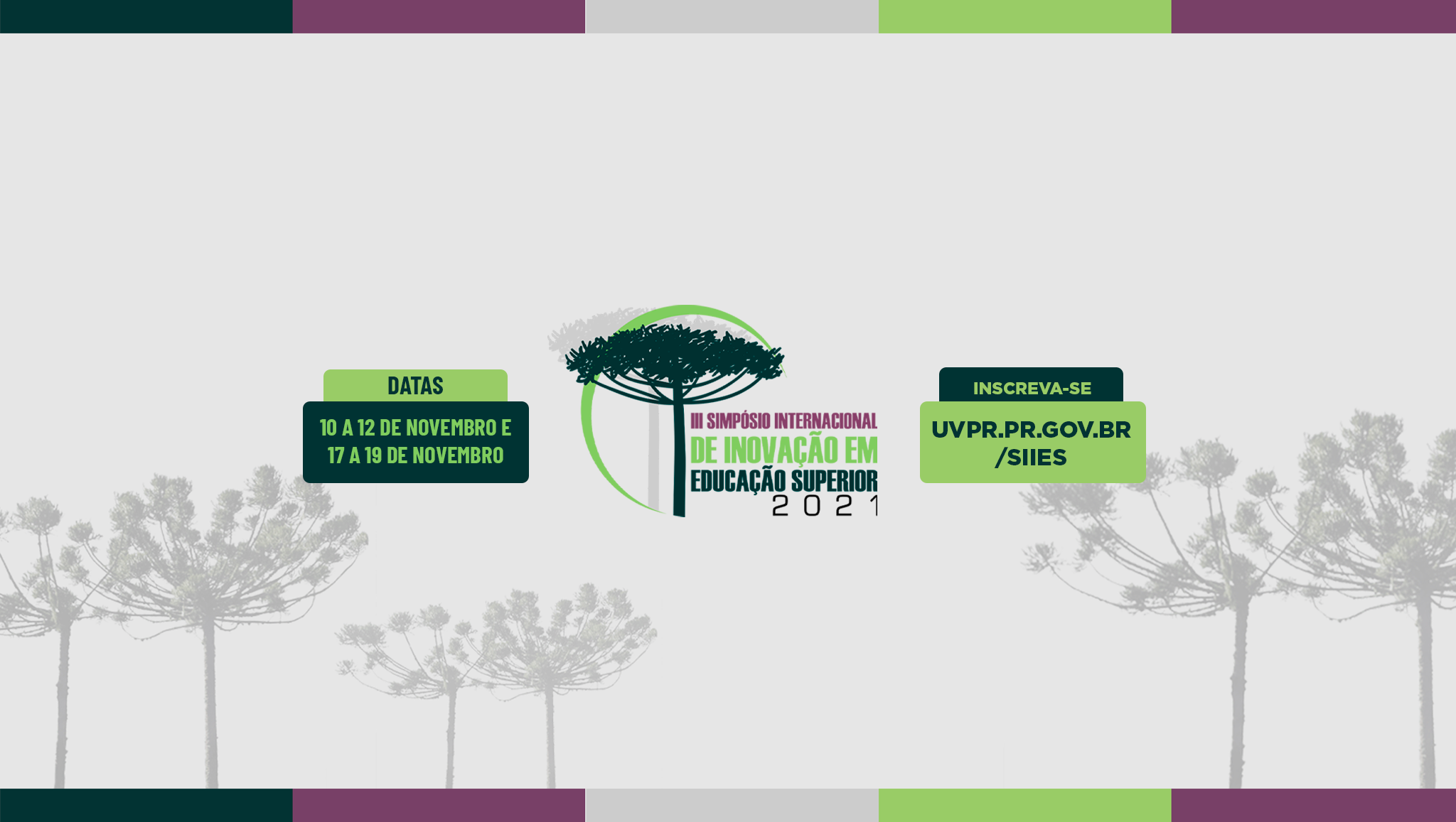 A terceira edição do Simpósio Internacional de Inovação em Educação Superior ocorrerá no mês de novembro de 2021, em duas etapas: de 10 a 12 e de 17 a 19. Ao todo, serão 16 painéis temáticos com convidados de destaque representando seis países. Além disso, o evento receberá trabalhos acadêmicos em três eixos temáticos. As inscrições estão abertas e podem ser feitas por meio do link uvpr.pr.gov.br/siies.