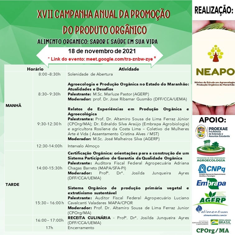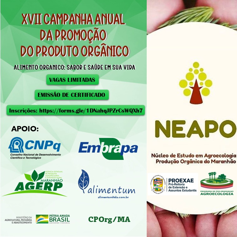 A Universidade Estadual do Maranhão (UEMA), por meio do Núcleo de Estudo em Agroecologia e Produção Orgânica do Maranhão (NEAPO), promove, dia 18 de novembro, a XVII Campanha Anual da Promoção do Produto Orgânico com tema “Alimento Orgânico: Sabor e Saúde em sua vida”.