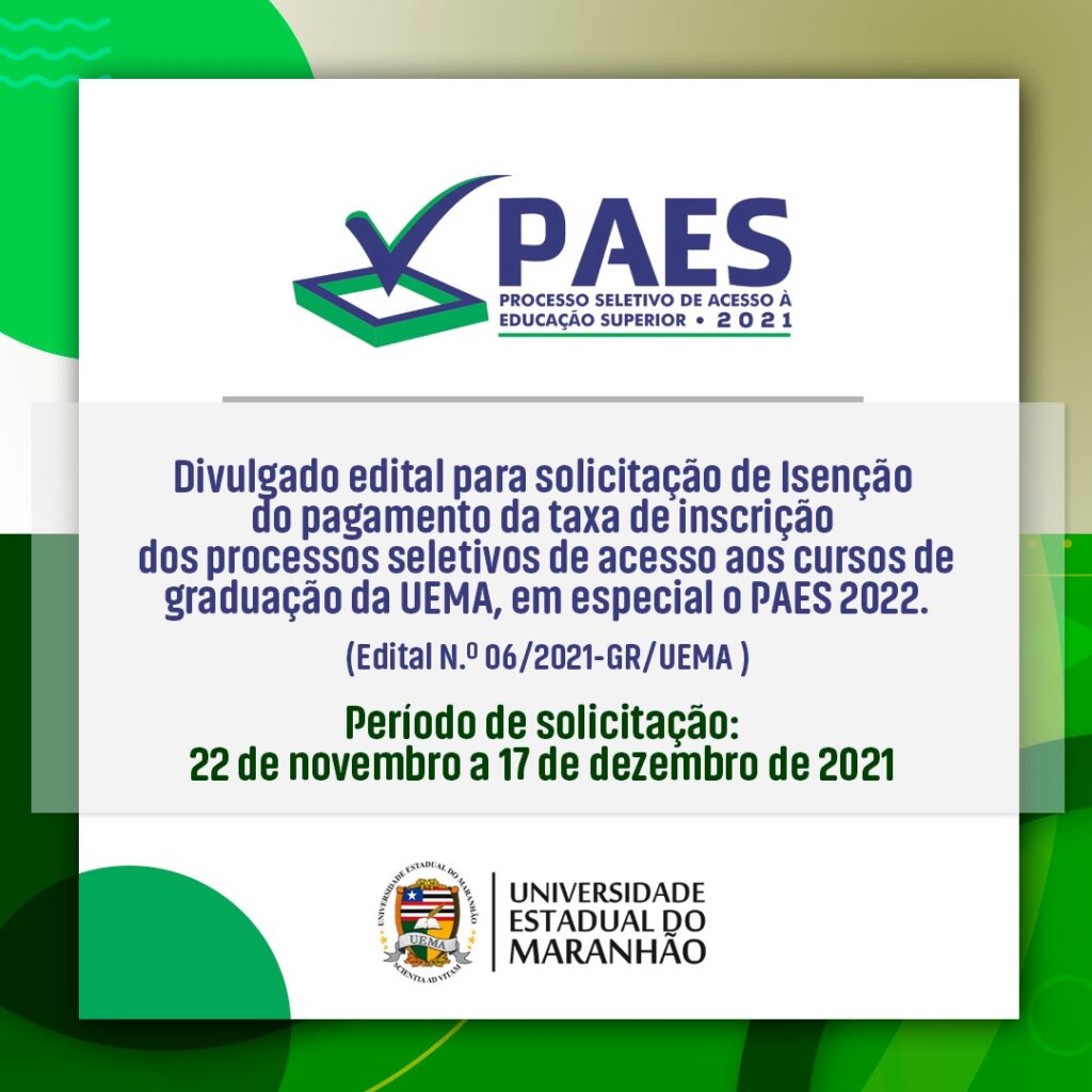 A Universidade Estadual do Maranhão (UEMA) divulgou. ontem (22). o edital de Solicitação de isenção da Taxa de Inscrição para os processos seletivos de acesso aos Cursos de Graduação da IES, em especial o PAES 2022.