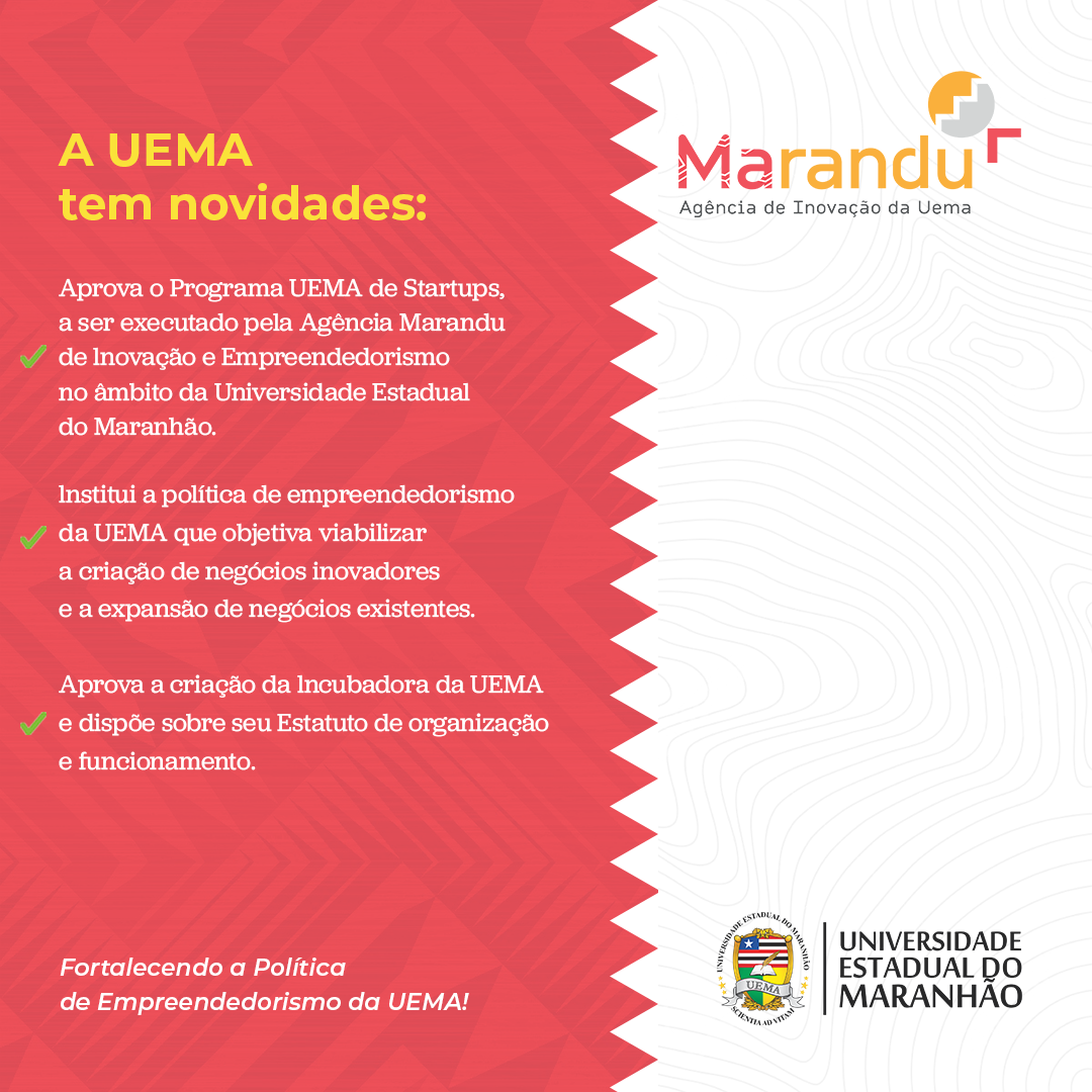 A Agência de lnovação e Empreendedorismo da UEMA – Marandu, instituída nos termos da Resolução n.o 102812019-CONSUN/UEMA, é o órgão responsável pela gestão da política de empreendedorismo da UEMA.