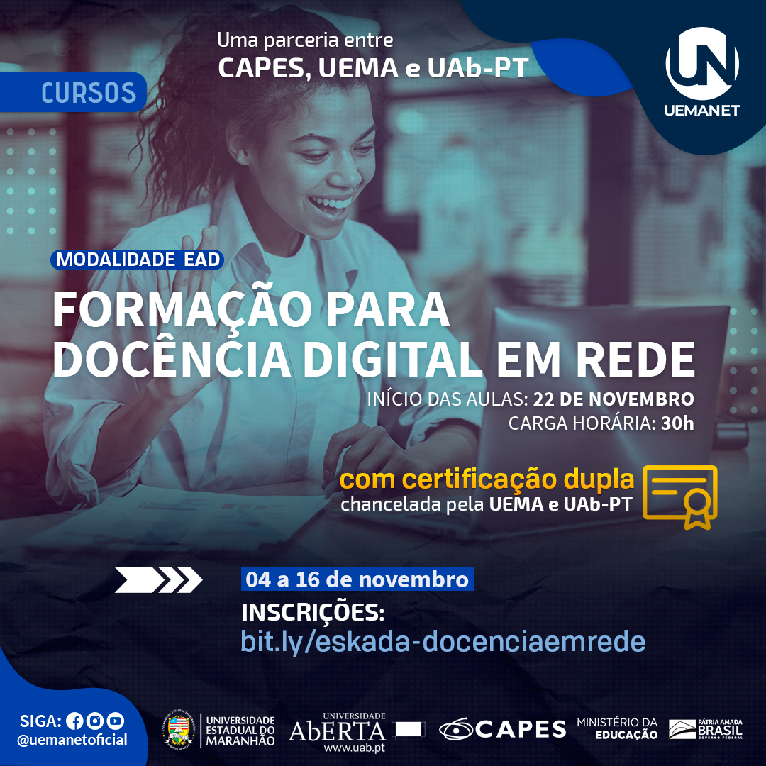 Em novembro, o curso online Formação para Docência Digital em Rede estará disponível na plataforma de cursos abertos, Eskada UEMA. A formação é fruto da parceria entre a Universidade Estadual do Maranhão (UEMA), Universidade Aberta de Portugal (UAb-PT) e Coordenação de Aperfeiçoamento de Pessoal de Nível Superior (CAPES). O curso será realizado na plataforma digital Eskada, do Núcleo de Tecnologias para Educação (UEMAnet) e terá coordenação compartilhada entre professores da UAb-PT e da UEMA. As inscrições abrem hoje (4) e vão até o dia 16 de novembro e podem ser feitas pelo site eskadauema.com.