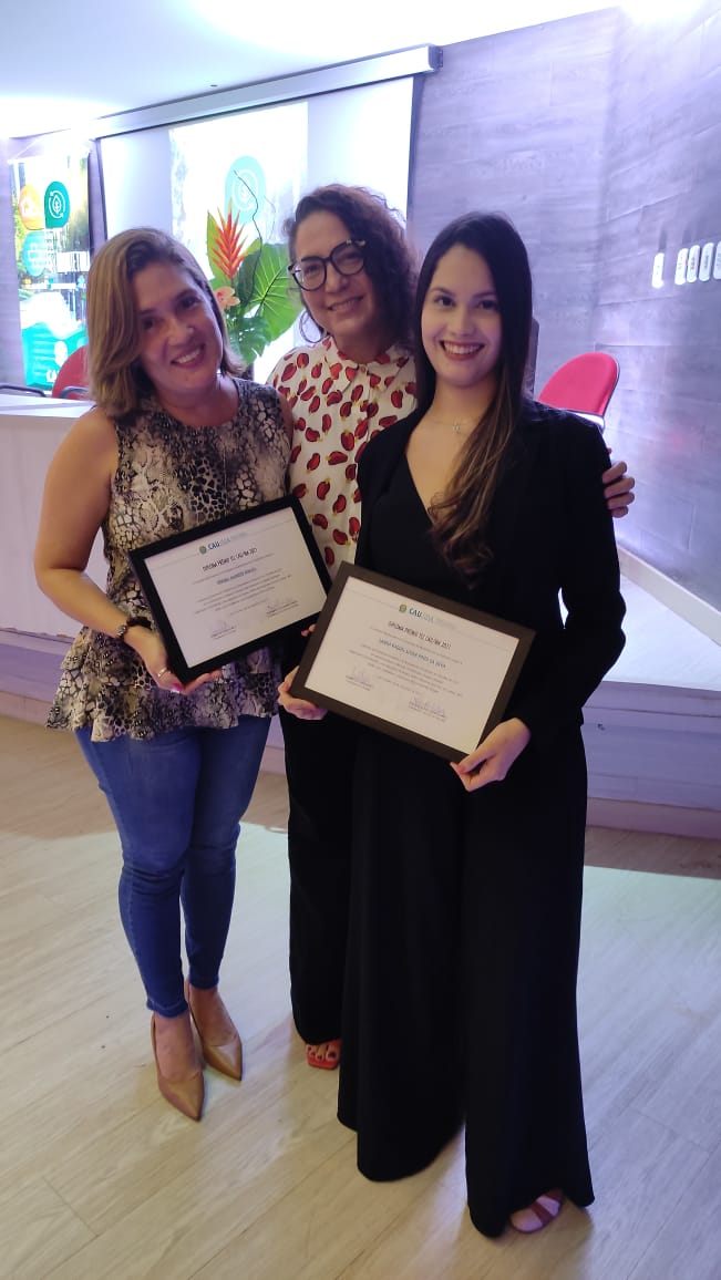 A aluna Lanna Raquel Sousa Pinto da Silva foi premiada com a Menção Honrosa com o trabalho “SINERGIA COWORKING: uma alternativa de espaço multiprofissional para Paço do Lumiar – MA”. O premio da aluna foi entregue pela professora Grete Soares Pflueger (Conselheira Federal suplente do CAU/MA). A diretora do Curso de Arquitetura e Urbanismo, Profa. Dra. Lúcia Moreira do Nascimento, também esteve presente na solenidade.