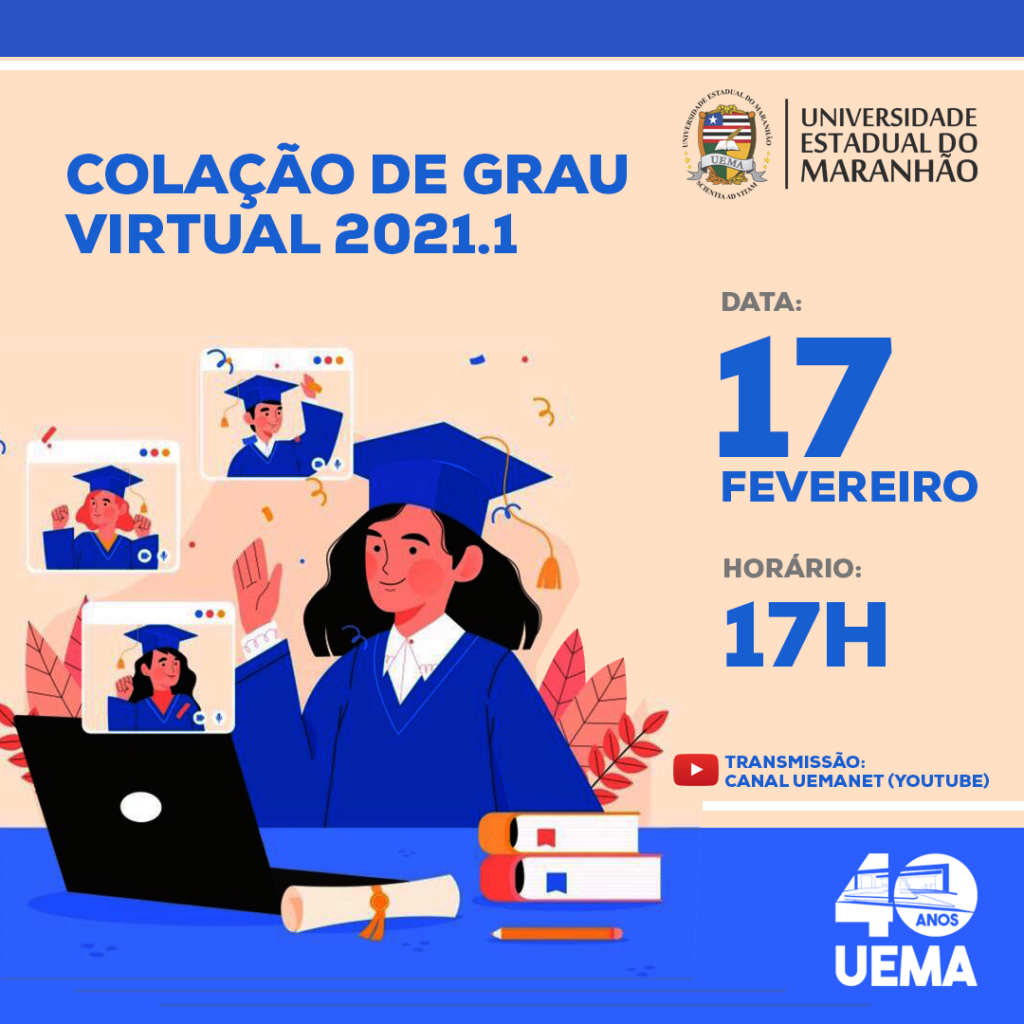 A Universidade Estadual do Maranhão (UEMA) realizará, amanhã(17), às 17h, a Cerimônia Virtual de Colação de Grau 2021.1 parte 2.
