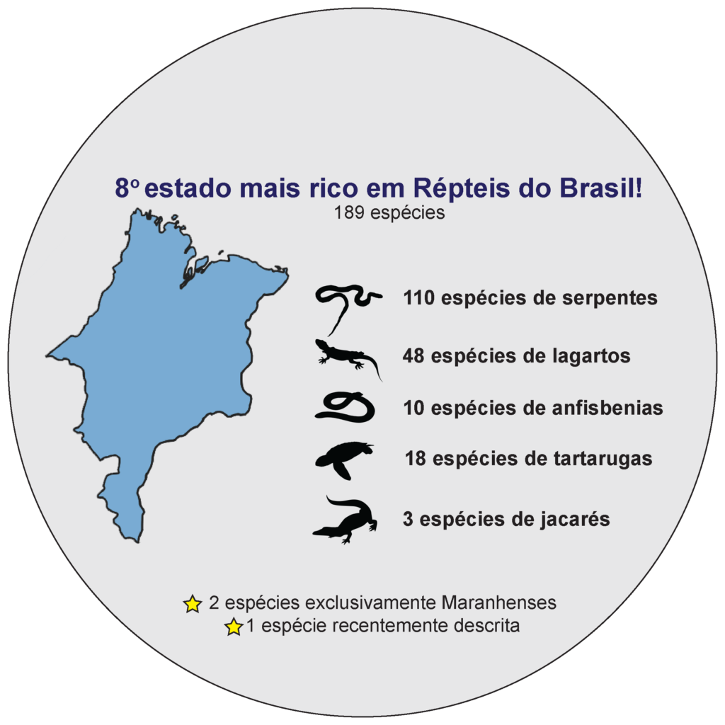 O Maranhão se destaca no cenário nacional, ocupando a 8ª posição quanto a riqueza de répteis no país com 189 espécies. São 110 espécies de serpentes, 48 de lagartos, 10 de anfisbenas, 18 de tartarugas e 3 de jacarés. Além disso, apresenta duas espécies exclusivas do seu território: Amphisbaena ibijara e Amphisbaena maranhensis (ambas anfisbenas). Em 2021, teve uma espécie descrita com base em exemplar coletado dentro do seu território (Atractus akerios, de Junco do Maranhão).