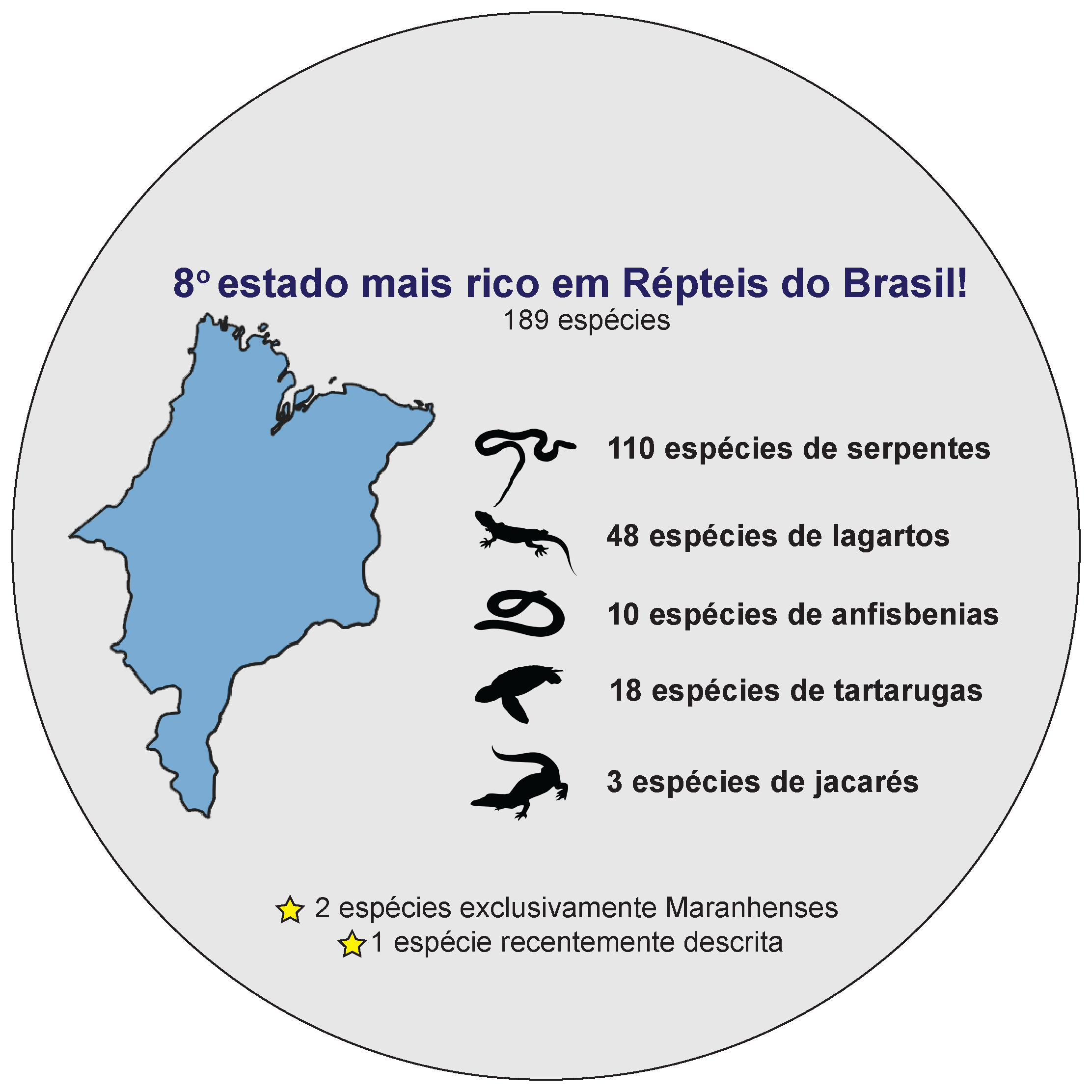 O Maranhão se destaca no cenário nacional, ocupando a 8ª posição quanto a riqueza de répteis no país com 189 espécies. São 110 espécies de serpentes, 48 de lagartos, 10 de anfisbenas, 18 de tartarugas e 3 de jacarés. Além disso, apresenta duas espécies exclusivas do seu território: Amphisbaena ibijara e Amphisbaena maranhensis (ambas anfisbenas). Em 2021, teve uma espécie descrita com base em exemplar coletado dentro do seu território (Atractus akerios, de Junco do Maranhão).