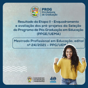 A Universidade Estadual do Maranhão divulga relação nominal dos candidatos aprovados na Etapa II – Enquadramento e avaliação dos projetos da Seleção para ingresso no Programa de Pós-Graduação em Educação (PPGE) – Mestrado Profissional em Educação, do edital nº 24/2021-PPG/UEMA.