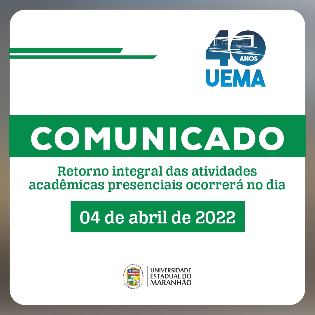 O reitor da Universidade Estadual do Maranhão, Gustavo Pereira da Costa, comunicou nesta sexta, 4, que o retorno integral das atividades acadêmicas presenciais dos cursos de graduação, previsto inicialmente para ocorrer no dia 14 de março de 2022, dar-se-á no dia 4 de abril de 2022, conforme o novo Calendário Acadêmico aprovado pelo Conselho de Ensino, Pesquisa e Extensão (CEPE) em reunião ocorrida no dia de ontem.