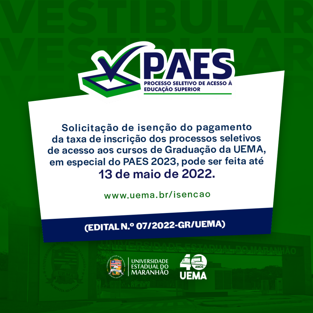 O processo de isenção abrange, excepcionalmente, a taxa de inscrição do PAES 2023 da UEMASUL, em decorrência de ajuste consolidado por meio do Acordo de Cooperação Técnica n.º 01/2019 entre as duas Instituições de Ensino Superior.