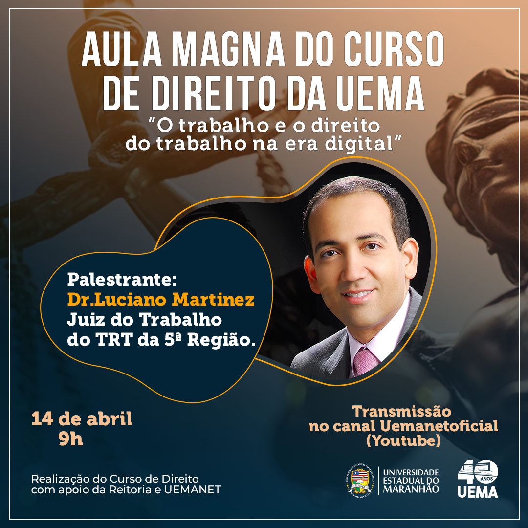 Na próxima quinta-feira (14), às 9h, acontece a Aula Magna do Curso de Direito, promovida pelo Curso de Direito da Universidade Estadual do Maranhão (UEMA) Campus São Luís e o Centro Acadêmico CALUTA.