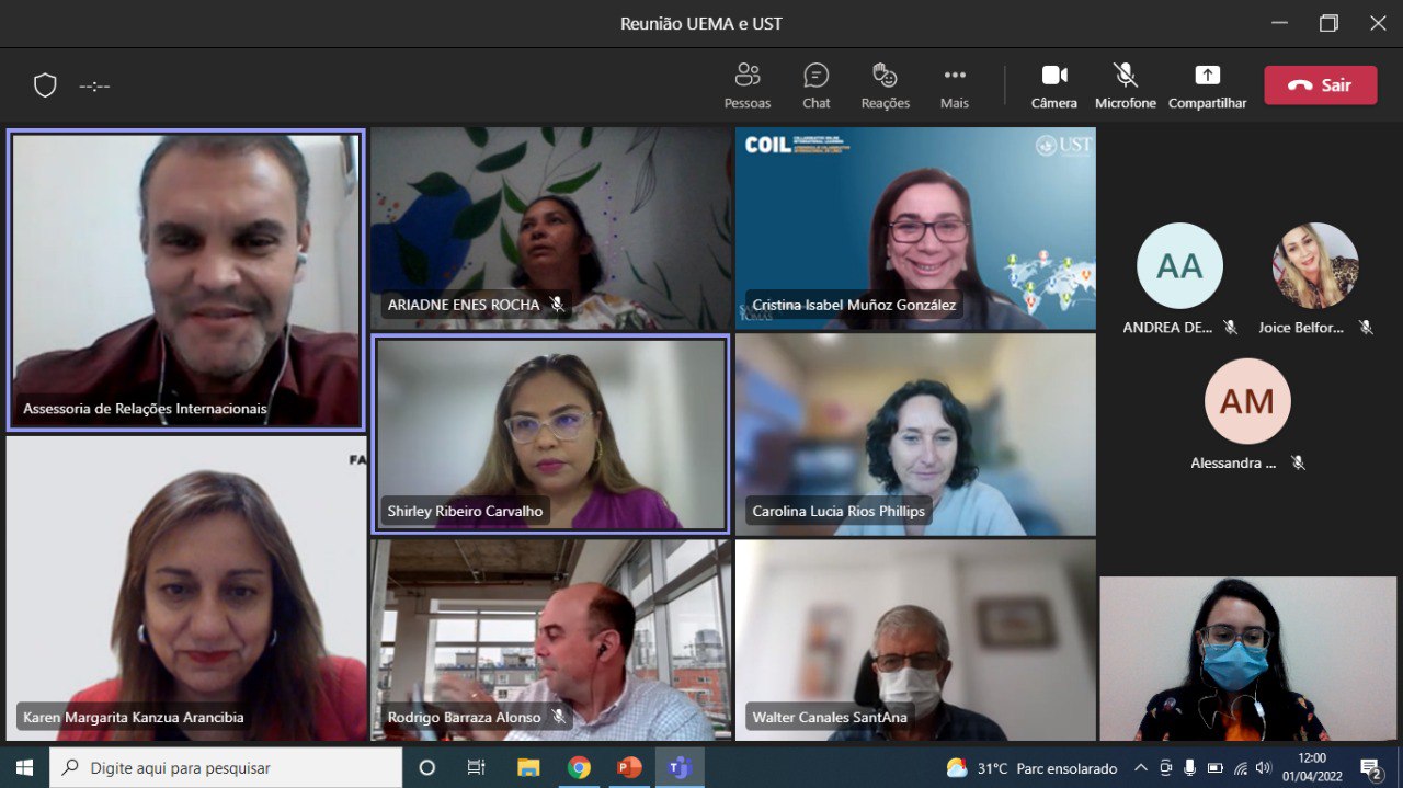 Estiveram presentes na reunião representando a UEMA a Profa. Dra. Ligia Tchaicka, docente no Programa de Pós-Graduação em Recursos Aquáticos e Pesca e no Programa de Pós-Graduação da Rede Bionorte; Dra. Ariadne Enes Rocha, Assessora-Chefe na Assessoria Especializada na Articulação dos Objetivos de Desenvolvimento Sustentável; Dra. Andréa Araújo do Carmo, Superintendente de Gestão Ambiental da UEMA; Dr. Gilson M. Mendonça, Assessor Especial da Reitoria; Stefanie Monteiro, Chefe da Divisão de Mobilidade Internacional e Joice Belfort, Chefe da Divisão de Cooperação Internacional.