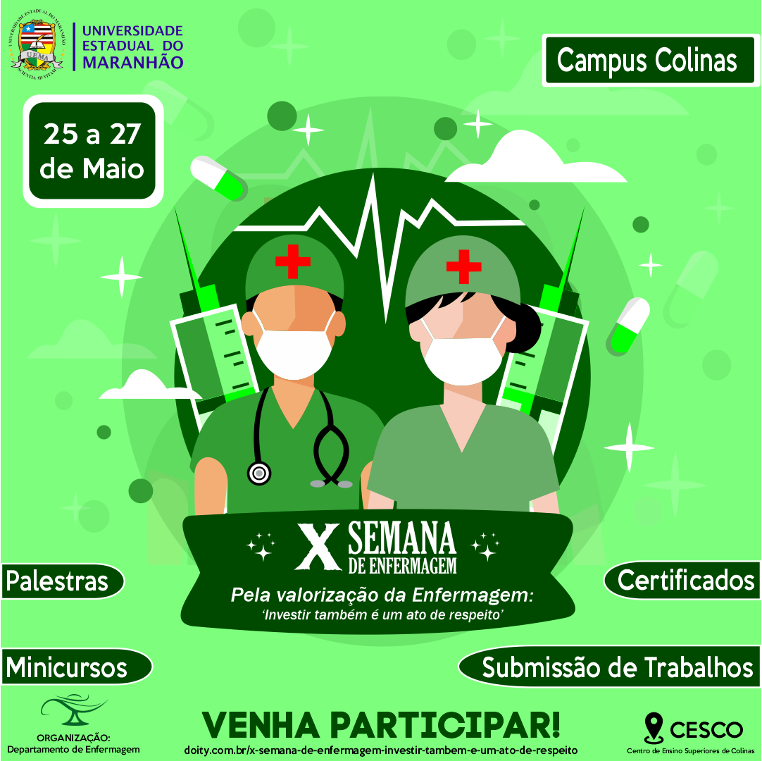 O Campus Colinas da Universidade Estadual do Maranhão (UEMA) realizará, de 25 a 27 de maio, a X Semana de Enfermagem, com o tema “Pela valorização da Enfermagem: Investir também é um ato de respeito”. O evento anual é realizado em alusão a Semana Nacional de Enfermagem, que é organizado pelo Departamento de Enfermagem do Campus Colinas.