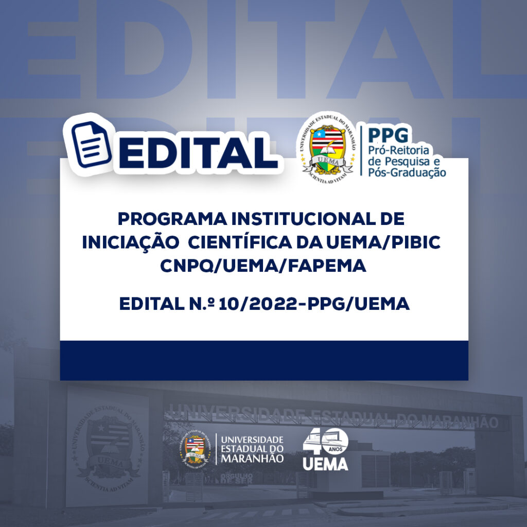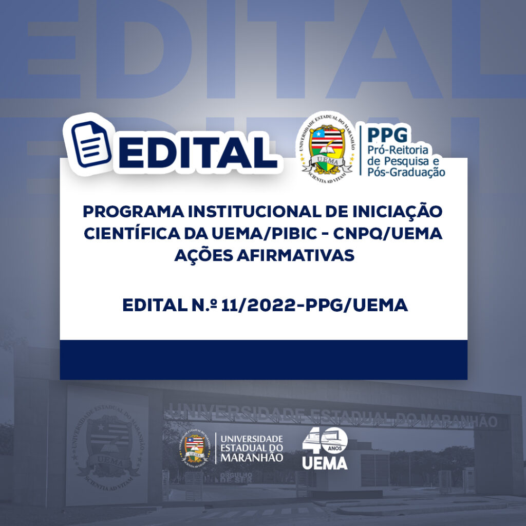 A Universidade Estadual do Maranhão, por meio da Pró-Reitoria de Pós-Graduação, divulgou os editais para seleção de projetos e orientadores  do PROGRAMA INSTITUCIONAL DE INICIAÇÃO CIENTÍFICA DA UEMA/PIBIC – CNPq/UEMA/FAPEMA e PROGRAMA INSTITUCIONAL DE INICIAÇÃO CIENTÍFICA DA UEMA/PIBIC – CNPq/UEMA – AÇÕES AFIRMATIVAS. O período de submissão será até 31 de maio.