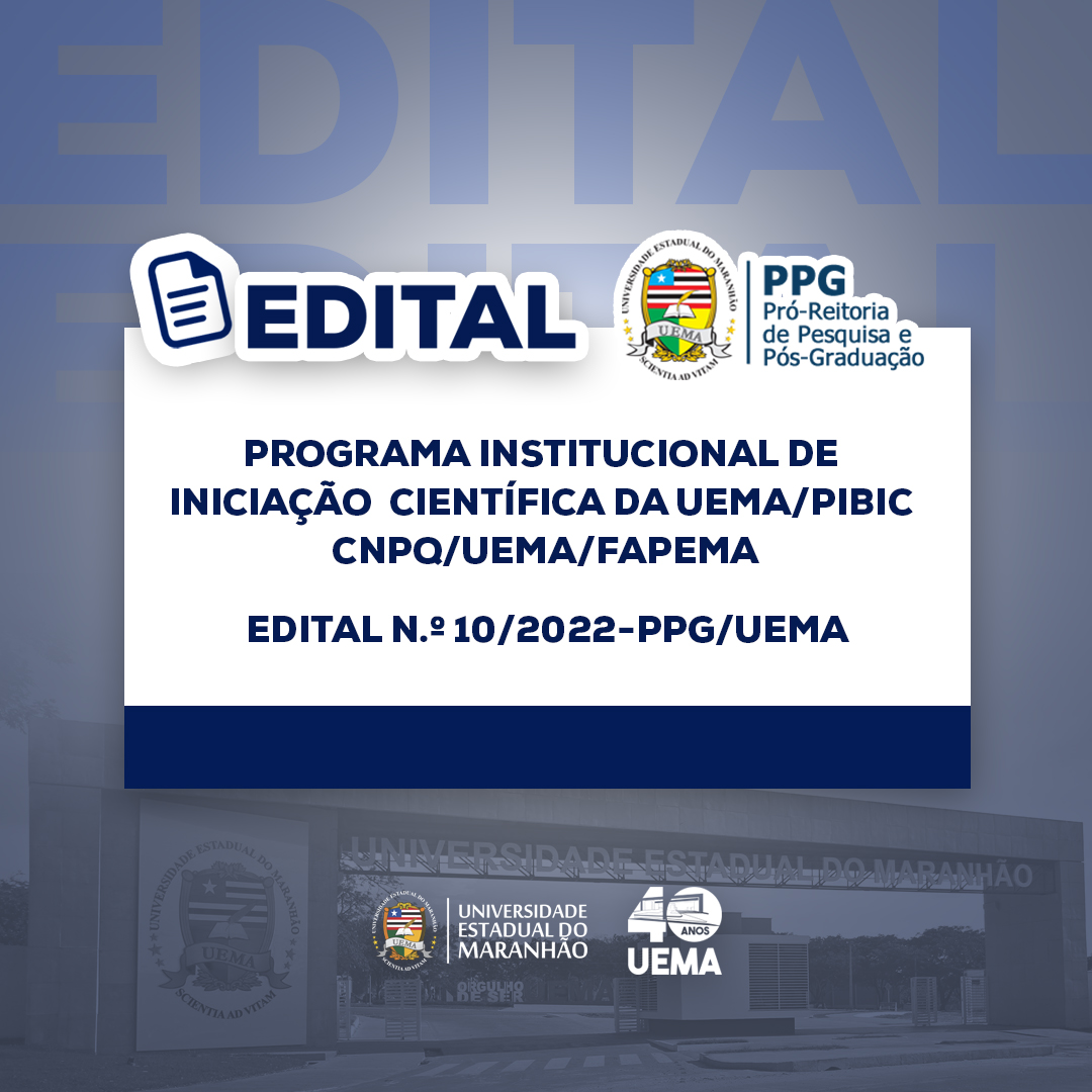 A Universidade Estadual do Maranhão, por meio da Pró-Reitoria de Pós-Graduação, divulgou os editais para seleção de projetos e orientadores  do PROGRAMA INSTITUCIONAL DE INICIAÇÃO CIENTÍFICA DA UEMA/PIBIC – CNPq/UEMA/FAPEMA e PROGRAMA INSTITUCIONAL DE INICIAÇÃO CIENTÍFICA DA UEMA/PIBIC – CNPq/UEMA – AÇÕES AFIRMATIVAS. O período de submissão será até 31 de maio.