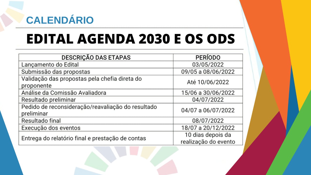 O objetivo do edital é apoiar financeiramente a realização de eventos na forma de congresso, conferência, seminário, simpósio, colóquio, encontro, fórum, jornada, curso, minicurso, treinamento, networking, workshop, festival e afins, de abrangência internacional, nacional, regional ou local, para a popularização da Agenda 2030 e dos ODS.