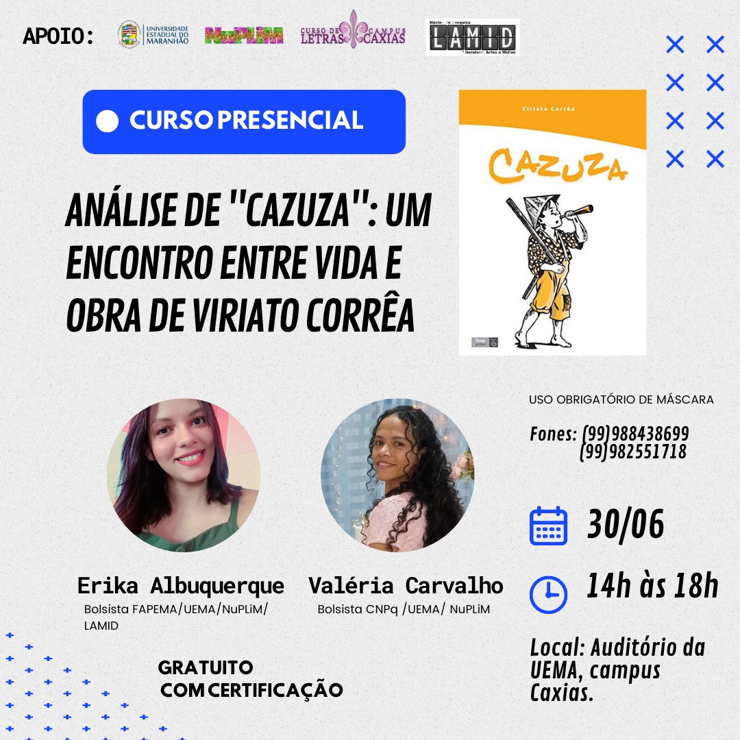 Curso de Letras do Campus Caxias da Universidade Estadual do Maranhão realiza, dia 30 de junho, das 14h às 18h, no auditório Leôncio Magno, um curso de curta duração intitulado “Análise de Cazuza: Um encontro entre vida e obra de Viriato Corrêa”. A proposta é estabelecer um diálogo entre obra e comunidade.