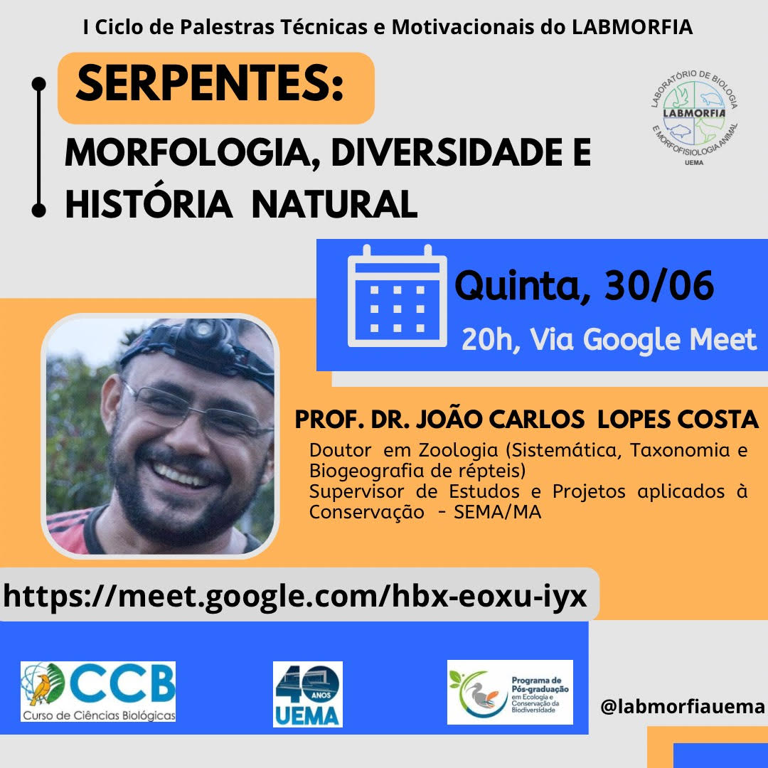 Dando continuidade ao Ciclo de Palestras Técnicas e Motivacionais do Labmorfia, nesta quinta-feira, dia 30 de junho, será realizada a palestra “Serpentes: morfologia, diversidade e história natural”, com o Prof. Dr. João Carlos Lopes Costa. Assista pelo link https://meet.google.com/hbx- eoxu-iyx.