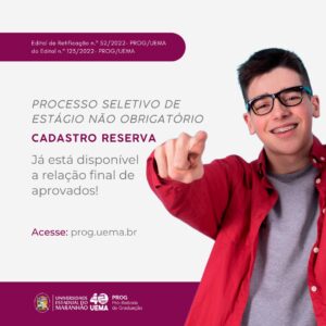 A Pró-Reitoria de Graduação (PROG), por meio da Divisão de Estágio e Monitoria, divulga a relação final de aprovados, por ordem de classificação, do Processo Seletivo de estágio não obrigatório destinado ao cadastro de reserva para as vagas da Reitoria, Pró-Reitorias e Centros desta IES, conforme cronograma do Edital de Retificação n.º 52/2022 – PROG/UEMA do Edital n.º 123/2022 – PROG/UEMA.