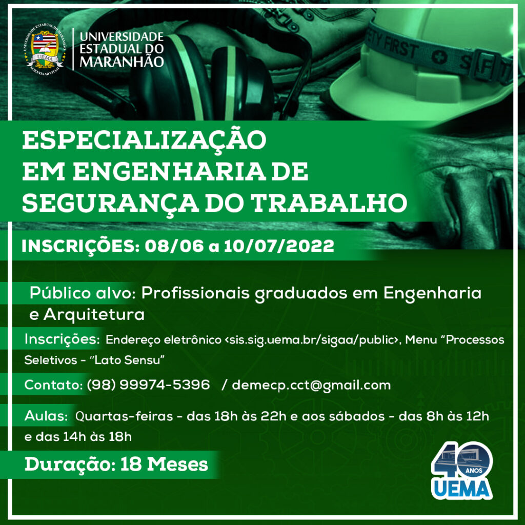 A Universidade Estadual do Maranhão, por meio da Pró-Reitoria de Pesquisa e Pós-Graduação, abre inscrições para o CURSO DE ESPECIALIZAÇÃO EM ENGENHARIA DE SEGURANÇA DO TRABALHO, até o dia 10 de julho, aprovado pela Resolução nº. 1522-2022-CEPE/UEMA, do Centro de Ciências Tecnológicas – CCT.