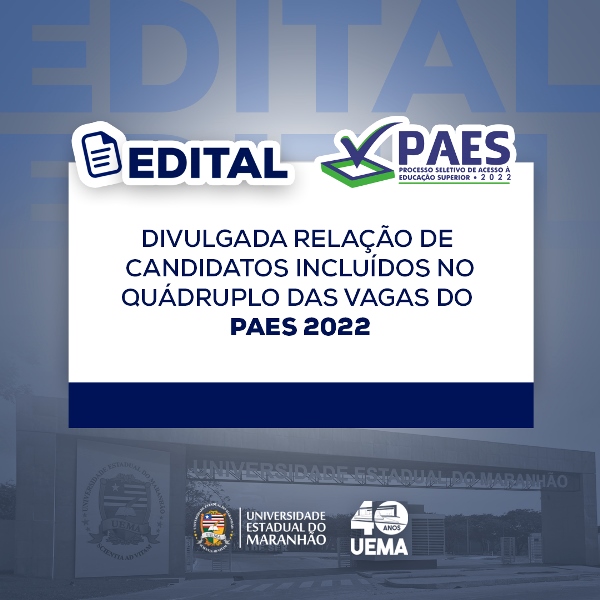 A Universidade Estadual do Maranhão (UEMA), por meio da Superintendência de Concursos e Seletivos (SUCONS), divulgou, hoje (10), a relação nominal dos candidatos incluídos no quádruplo das vagas do Processo Seletivo de Acesso à Educação Superior – PAES 2022.