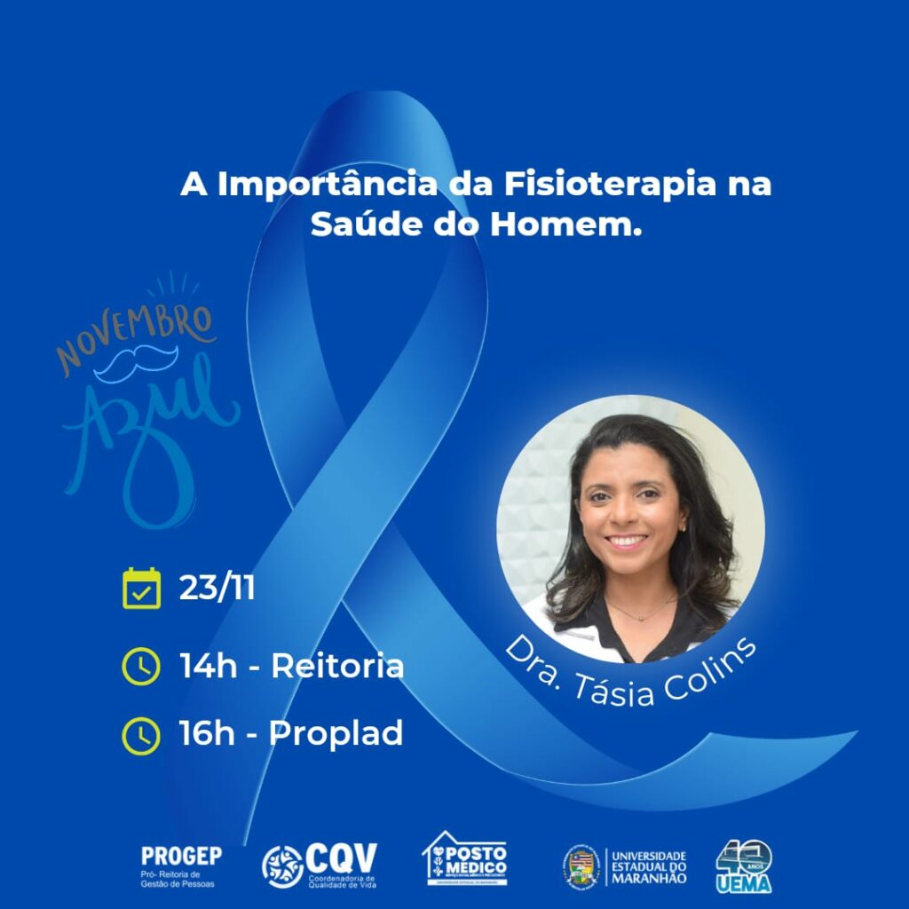 Pensando nisso, a Pró-Reitoria de Gestão de Pessoas (PROGEP), por meio da Coordenação de Qualidade de Vida, realizará palestras sobre o Novembro Azul, com o tema “A importância da fisioterapia na saúde do homem”, dia 23 de novembro, às 14h, na sala de reunião da Reitoria, e às 16h, no gabinete da PROPLAD. A palestrante será a Dra. Tásia Colins.