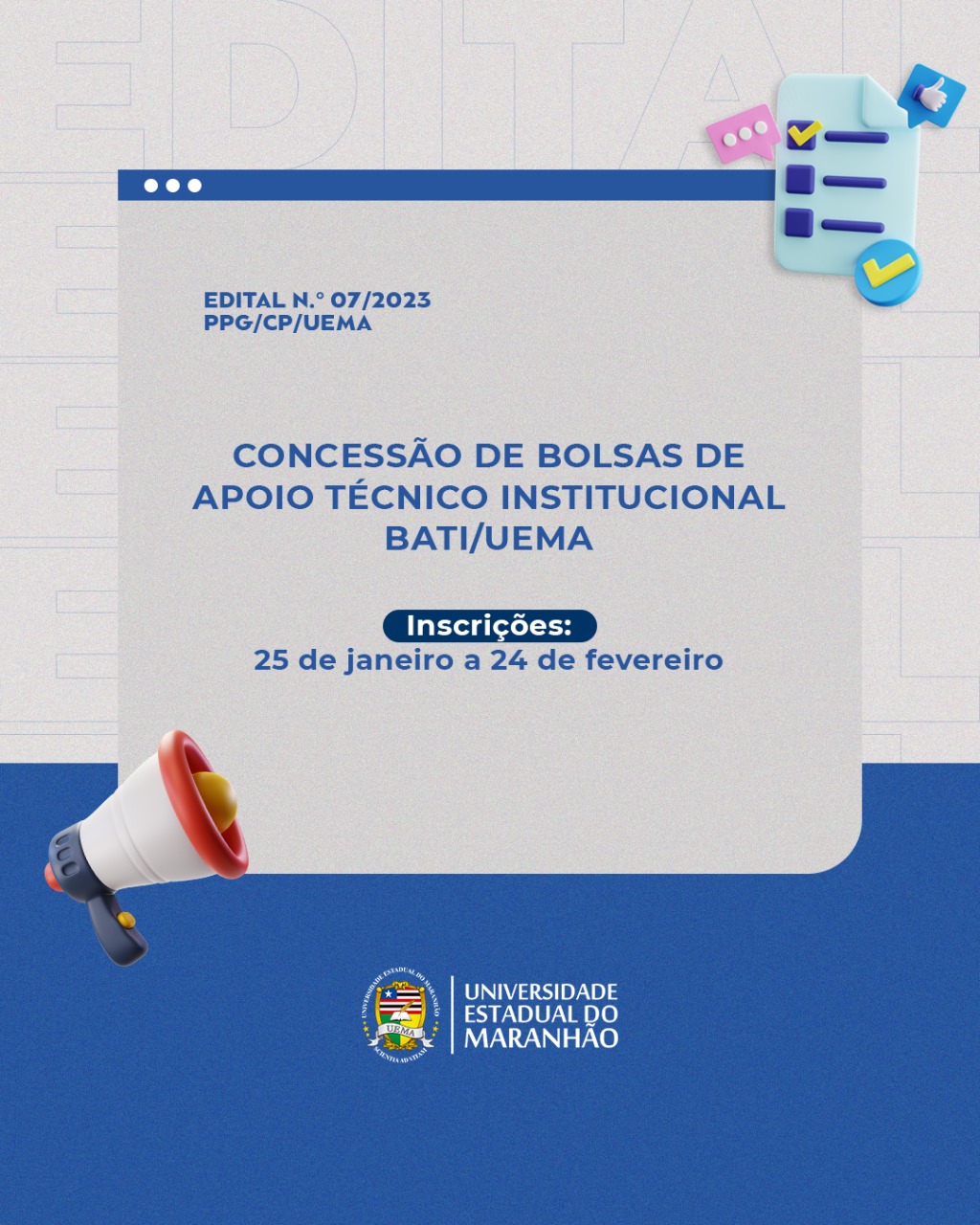 A Pró-Reitoria de Pesquisa e Pós-Graduação da Universidade Estadual do Maranhão – PPG/UEMA, em consonância com a Resolução n.º 170/2013-CAD/UEMA e a Resolução n.º 397/2022-CAD/UEMA, torna público o presente Edital para seleção de propostas ao Programa de Bolsas de Apoio Técnico Institucional – BATI, no período de 25 de janeiro a 24 de fevereiro de 2023, na forma e condições contidas neste Edital.