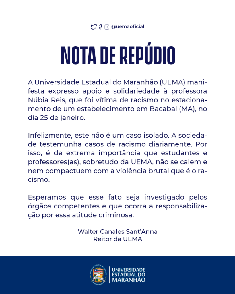 A Universidade Estadual do Maranhão (UEMA) manifesta expresso apoio e solidariedade à professora Núbia Reis, que foi vítima de racismo no estacionamento de um estabelecimento em Bacabal (MA), no dia 25 de janeiro.