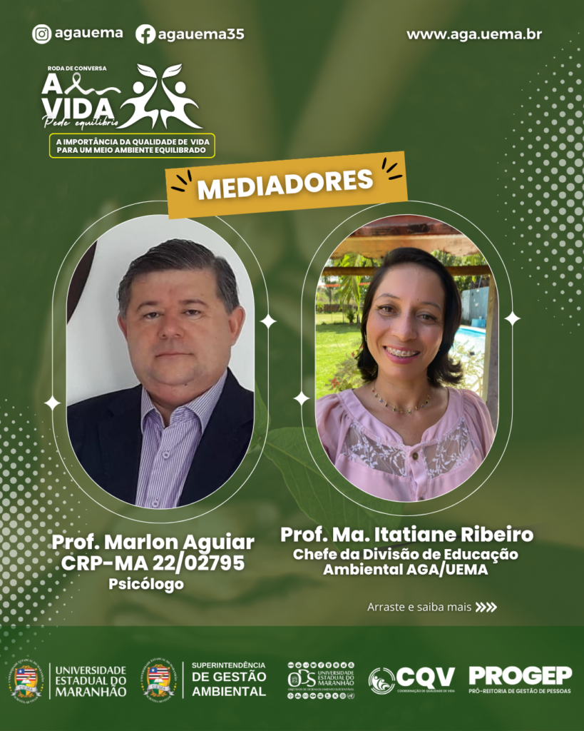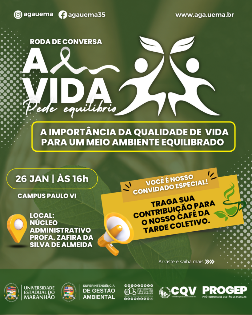 A Superintendência de Gestão Ambiental (AGA) e a Pró-Reitoria de Gestão de Pessoas (PROGEP) da Universidade Estadual do Maranhão (UEMA) promovem, dia 26 de janeiro, às 16h, no Núcleo Administrativo Profa. Zafira da Silva de Almeida, uma roda de conversa sobre o tema “A vida pede equilíbrio: a importância da qualidade de vida para um meio ambiente equilibrado”.