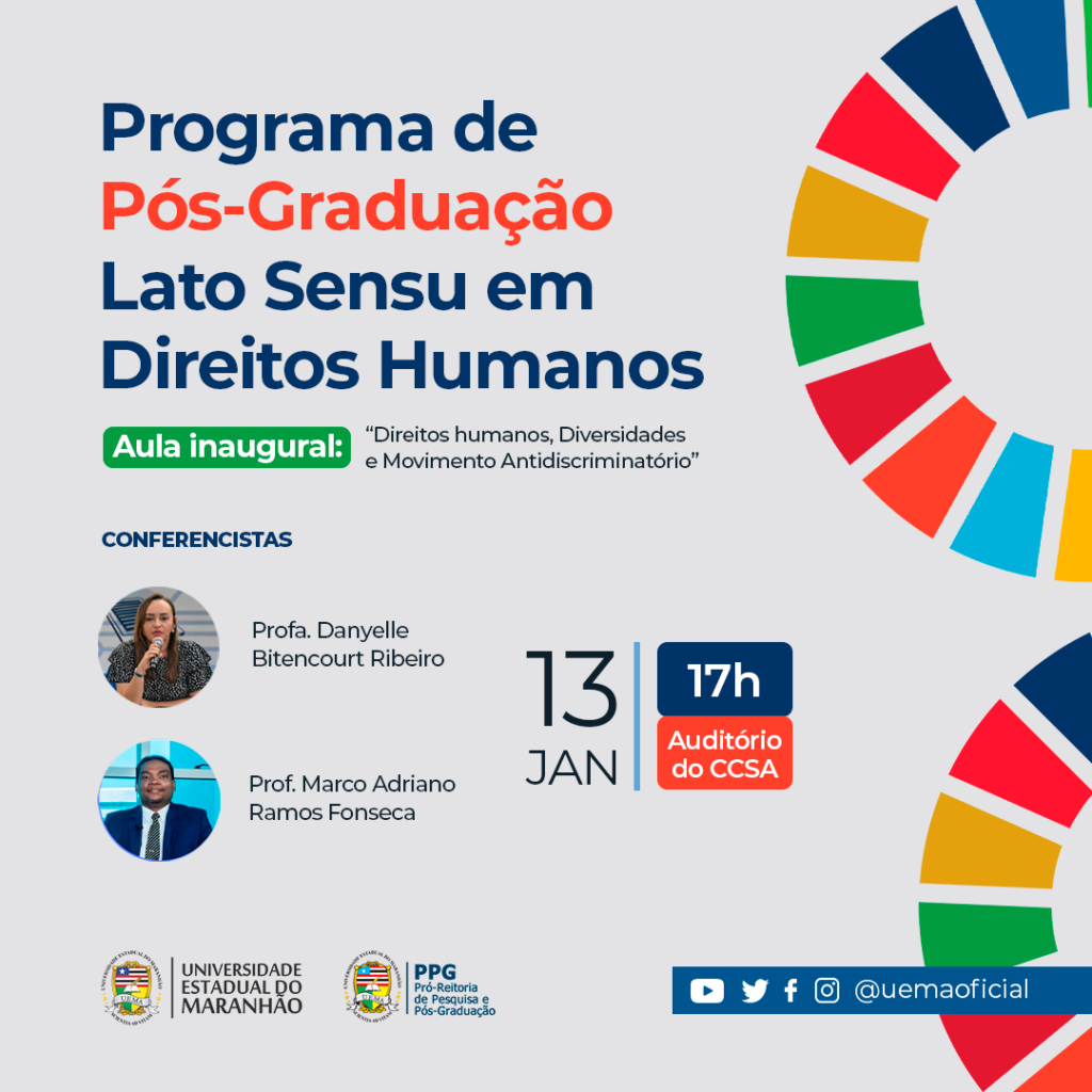 A Universidade Estadual do Maranhão (UEMA) realizará sexta-feira(13), às 17h, no Auditório do CCSA, a Aula Inaugural da primeira turma do Curso de Especialização em Direitos Humanos.