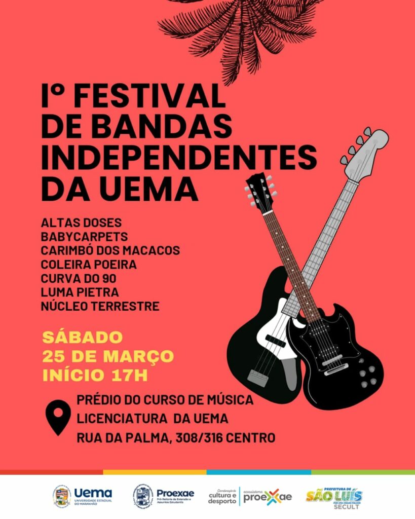 Não esquece essa data! dia 25 de março (sábado), acontecerá o “1º Festival de Bandas Independentes da UEMA”, evento criado por Lucas Ferreira (Babycarpets), com a diretoria do curso de Música Licenciatura em parceria com a Coordenação de Cultura e Desporto da UEMA.