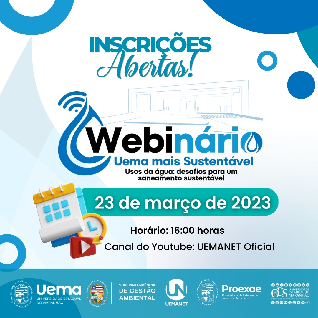 inscrições para o Webinário “UEMA MAIS SUSTENTÁVEL USOS DA ÁGUA: desafios para um saneamento sustentável” que ocorrerá no dia 23 de março de 2023 seguem abertas. Evento totalmente gratuito e 100% online, transmitidos pelo canal do YouTube: UEMANET OFICIAL