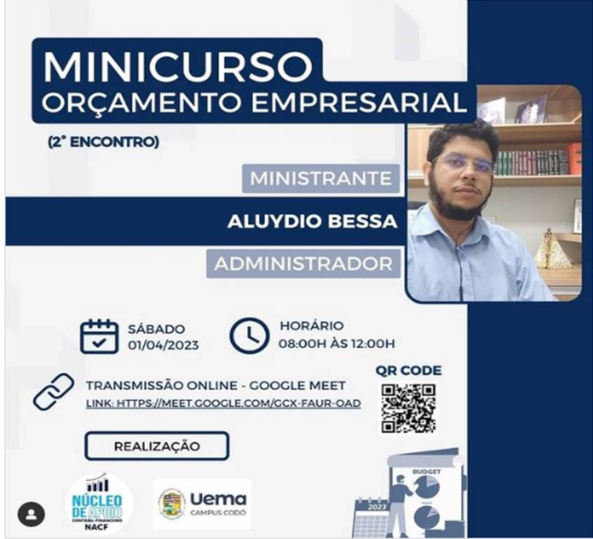 O Núcleo de Apoio Contábil-Financeiro (NACF) do Campus Codó da Universidade Estadual do Maranhão (Uema) realizará no próximo sábado (01), das 8h às 12h, o minicurso sobre Orçamento Empresarial (2° ENCONTRO) com o objetivo de traçar um planejamento financeiro, que permita projetar as receitas e despesas da empresa em um determinado período.