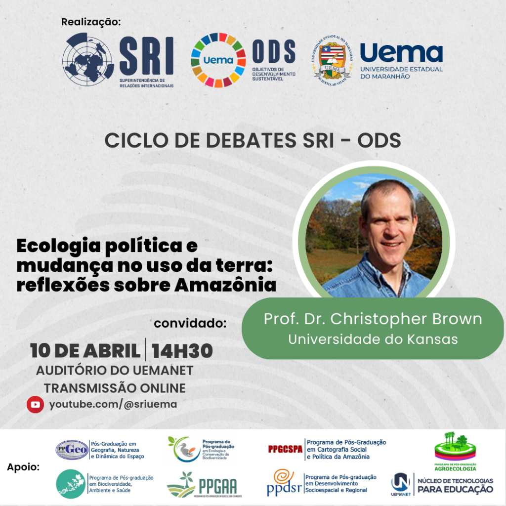 No dia 10 de abril, a Universidade Estadual do Maranhão – UEMA, por meio da Superintendência de Relações Internacionais – SRI e Assessoria Especializada na Articulação dos Objetivos de Desenvolvimento Sustentável ODS – UEMA, realiza o Ciclo de Debates SRI – ODS. O primeiro convidado é o prof. Dr. Christopher Brown, da Universidade do Kansas, Estados Unidos, que ministrará a palestra “Ecologia política e mudança no uso da terra: reflexões sobre Amazônia”, às 14h30, no Auditório do UEMAnet. O evento também será transmitido pelo YouTube, no canal oficial da Superintendência (youtube.com/@sriuema).
