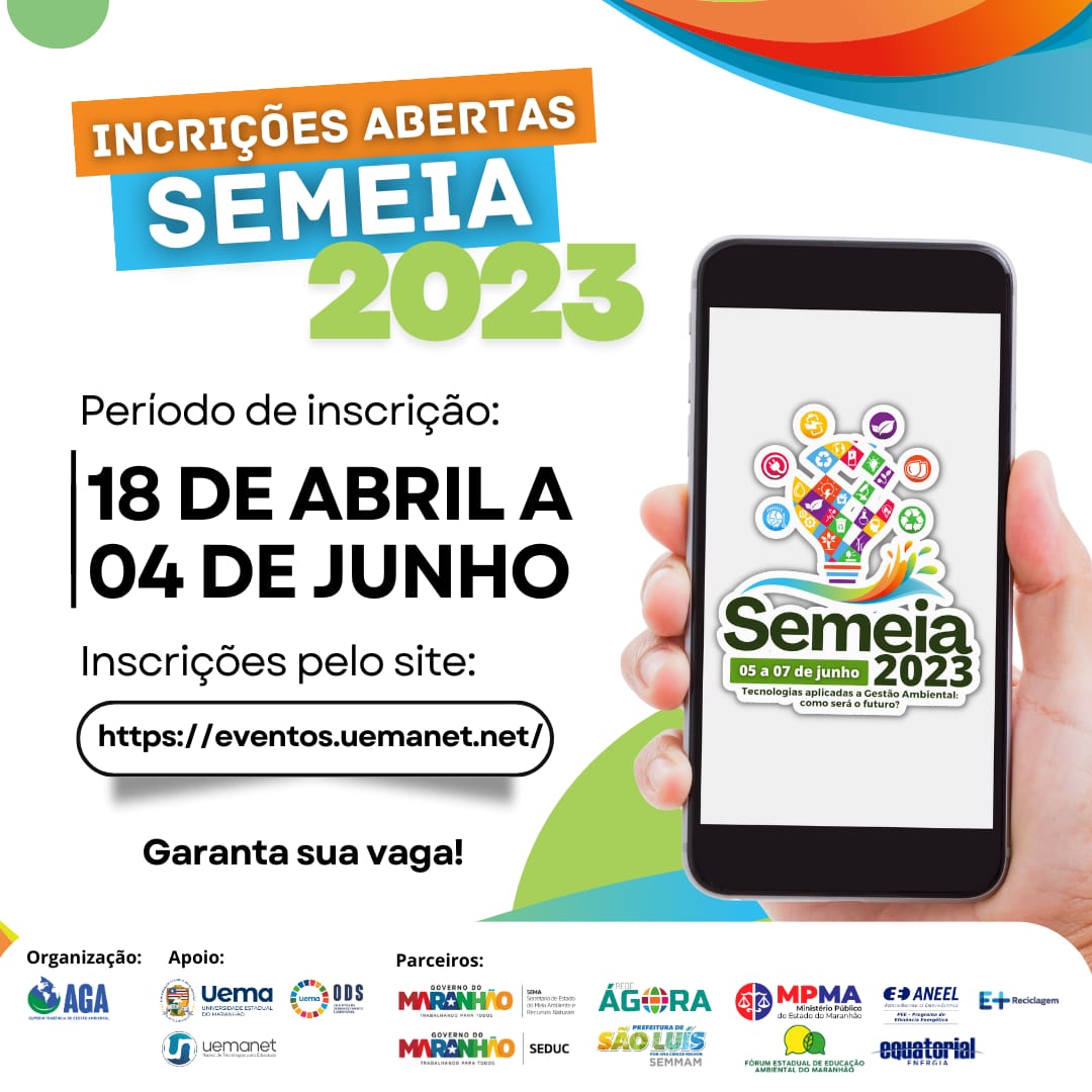 Estão abertas as inscrições para o Semeia 2023, organizado pela Superintendência de Gestão Ambiental (AGA) da Universidade Estadual do Maranhão (UEMA). Os interessados podem realizar a inscrição de forma gratuita e online clicando aqui. O prazo de inscrição vai até o dia 4 de junho de 2023.