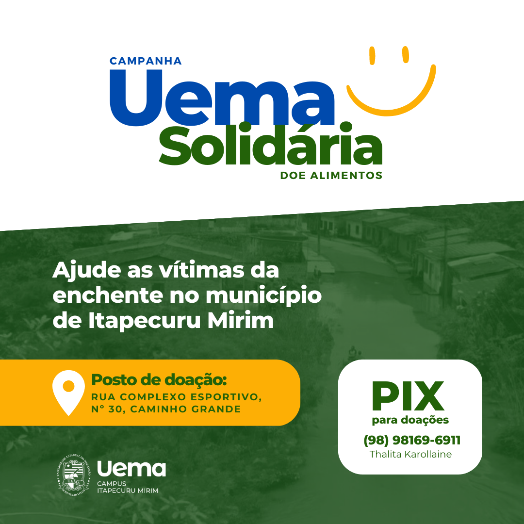 A Universidade Estadual do Maranhão (Uema) – Campus Itapecuru Mirim se solidariza e convida você a participar da Campanha de arrecadação de alimentos e produtos de higiene que serão doados às famílias afetadas pela enchente do Rio Itapecuru.