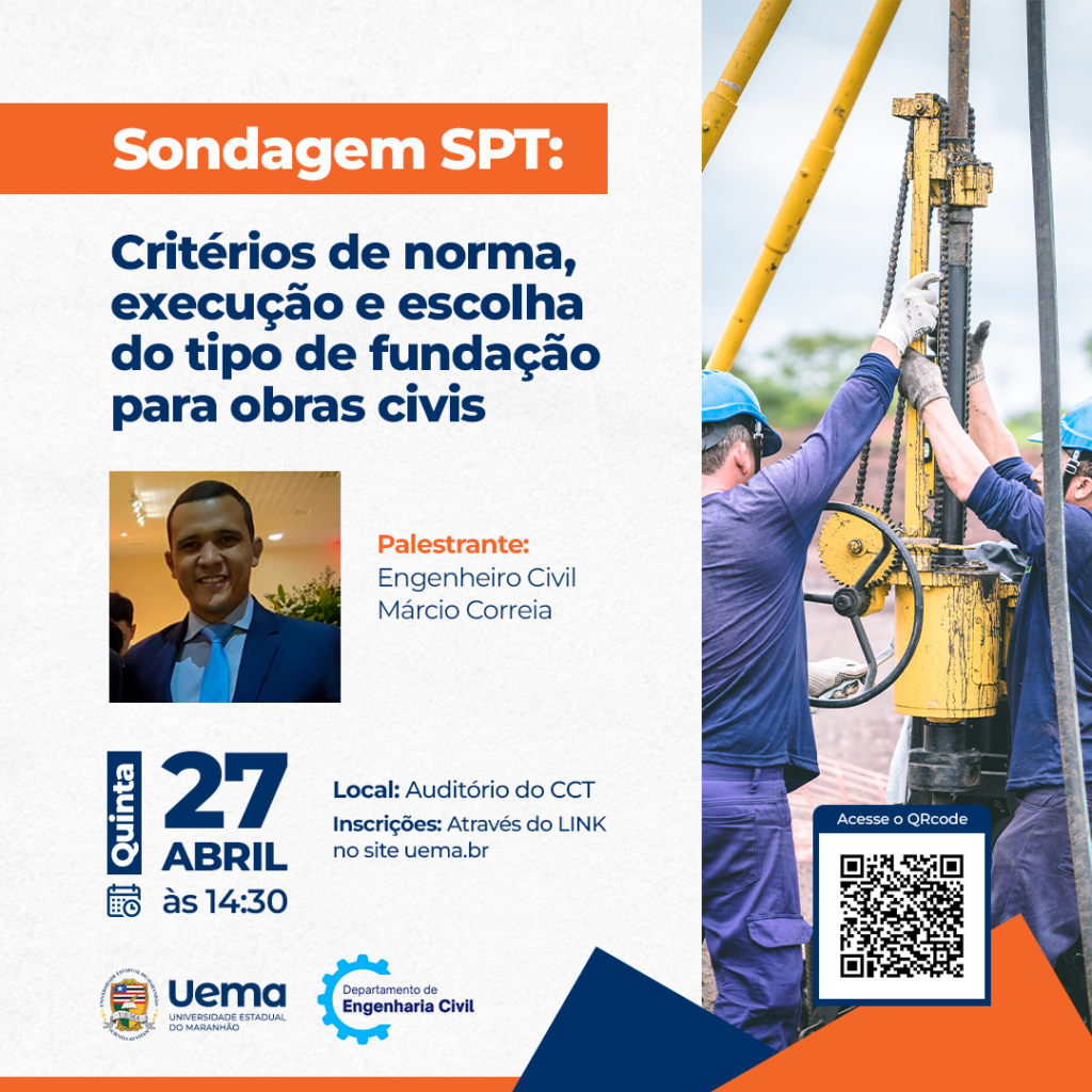 O Curso de Engenharia Civil (DEC) da Universidade Estadual do Maranhão (Uema) promoverá, na próxima quinta-feira (27), às 14h30, no auditório do Centro de Ciências Tecnológicas (CCT) – Campus Paulo VI, a palestra “Sondagem SPT: critérios de norma, execução e escolha do tipo de fundação para obras civis“, trazendo como Palestrante o Engenheiro Civil Márcio Correia.