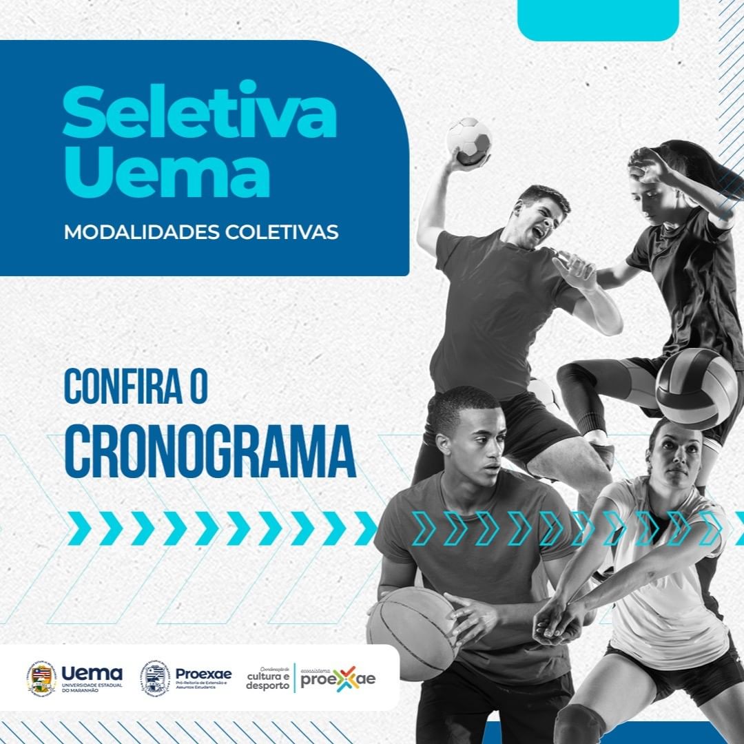 Foi divulgado o cronograma semanal da Seletiva UEMA 2023 das modalidades coletivas. A programação é uma iniciativa da Proexae, por meio da coordenação de desporto e cultura, em parceria com o núcleo de esporte e lazer, que buscar fomentar o recrutamento de alunos e atletas regularmente matriculados na Universidade Estadual do Maranhão (UEMA).