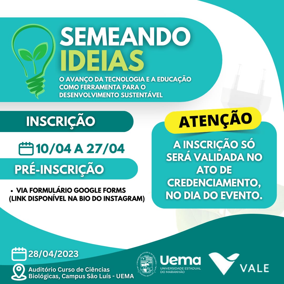 A Universidade Estadual do Maranhão em parceria com a Vale S.A, mineradora multinacional brasileira e uma das maiores operadoras de logística do país, promoverá no dia 28 (sexta-feira), às 8h da manhã, o evento Semeando Ideias, sobre o avanço da tecnologia e a educação como ferramenta para o desenvolvimento sustentável.