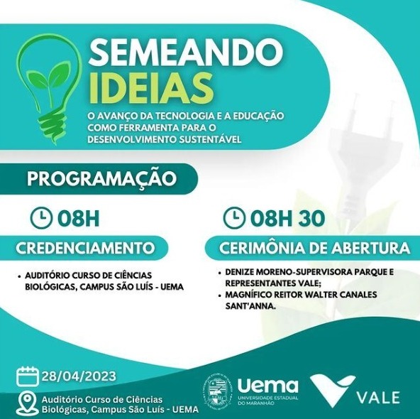 Reagendado para a próxima sexta-feira (12), o evento “Semeando Ideias”, uma parceria da Universidade Estadual do Maranhão e Vale S.A, mineradora multinacional brasileira e uma das maiores operadoras de logística do país, organizado e promovido pela Superintendência de Gestão Ambiental, mantém a programação idealizada inicialmente.