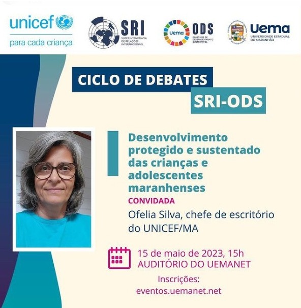 A Universidade Estadual do Maranhão por meio da Superintendência de Relações Internacionais e a Assessoria Especializada na Articulação dos Objetivos de Desenvolvimento Sustentável ODS-Uema, irão realizar no dia 15 de maio o segundo encontro do Ciclo de Debates SRI-ODS. A convidada do evento é Ofélia Silva, chefe de escritório do UNICEF no Maranhão, que ministrará a palestra “Desenvolvimento protegido e sustentado das crianças e adolescentes maranhenses”, às 15h00, no Auditório do UEMAnet, Campus São Luís.