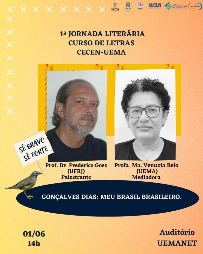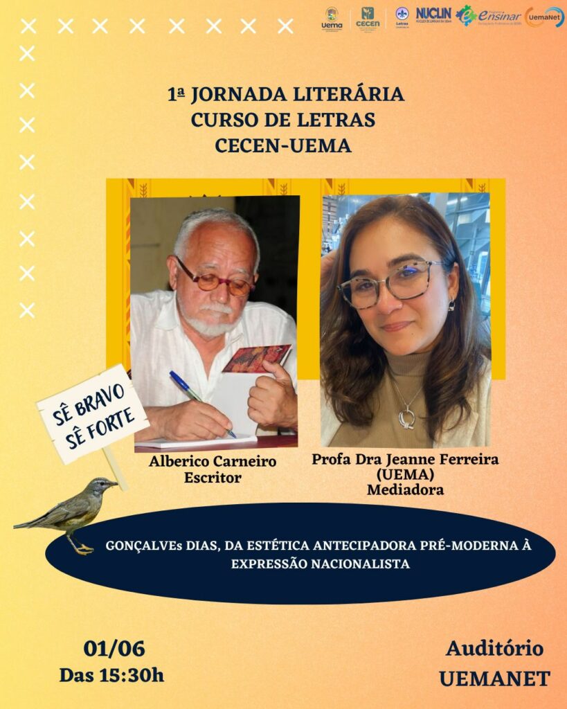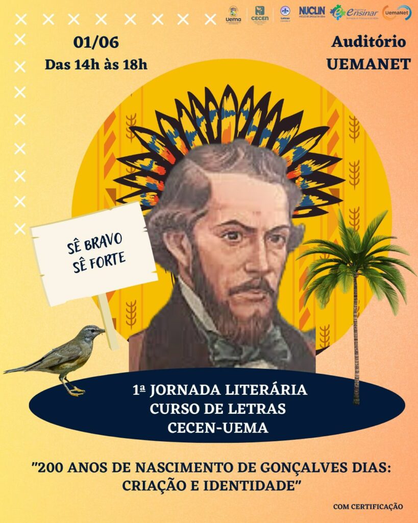 A Universidade Estadual do Maranhão, por meio do Curso de Letras, realizará a I Jornada Literária do Curso de Letras, com o tema “200 anos de Nascimento de Gonçalves Dias: Criação e Identidade”, dia 01 de junho, no auditório do Núcleo de Tecnologias para Educação – UEMANet, das 14h às 18h.