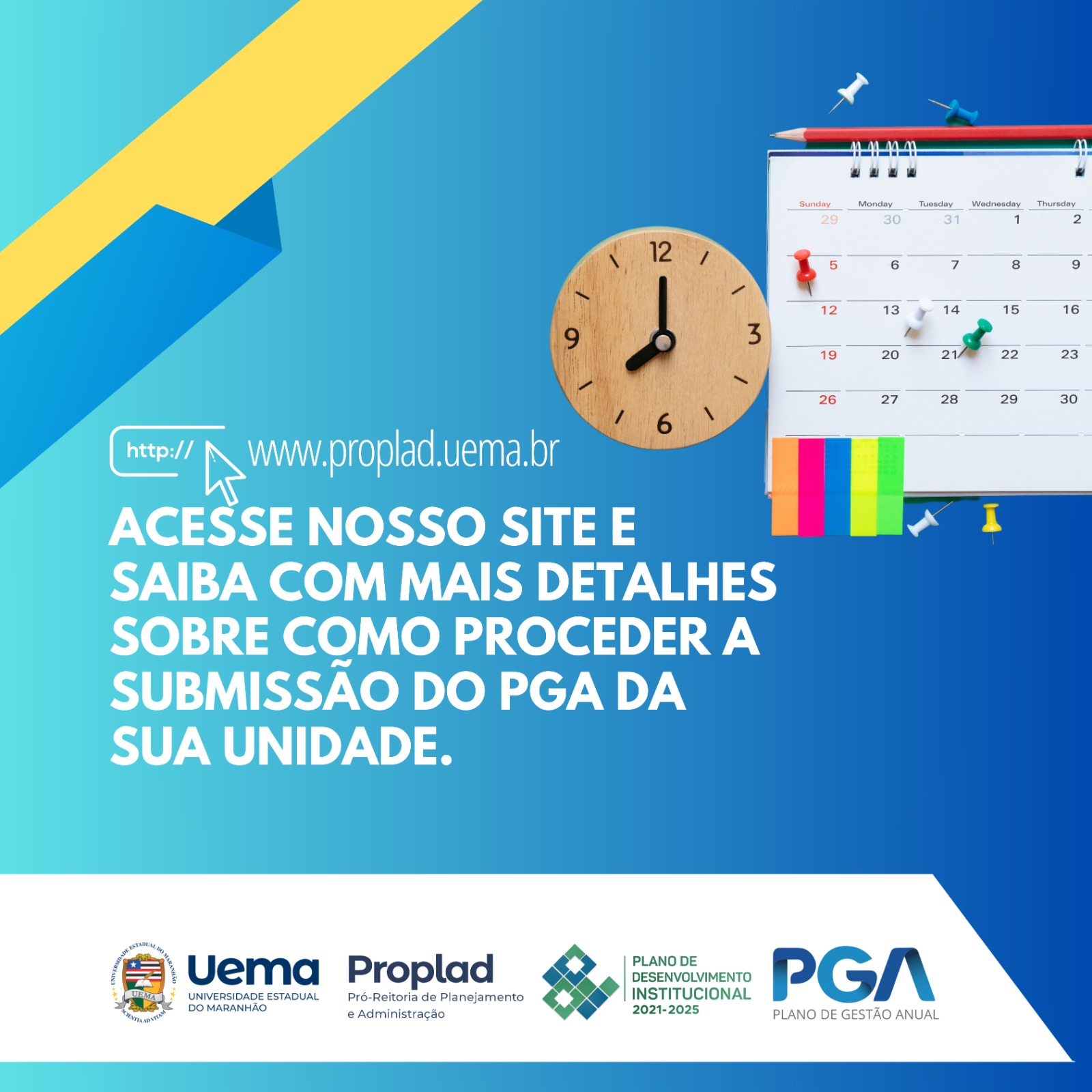 A Universidade Estadual do Maranhão (Uema), por meio da Coordenação de Desenvolvimento Institucional e Gestão da Pró-Reitoria de Planejamento e Administração (PROPLAD), informa que, por razões estratégicas e de adequação ao Planejamento da Universidade, do Governo, Planejamento de Estado (Maranhão 2050), do PPA (Plano Plurianual) e da LOA (Lei Orçamentária Anual) o processo de submissão das ações para o Plano de Gestão Anual – PGA de cada unidade administrativa da Universidade será estendido até o dia 28 de julho de 2023.